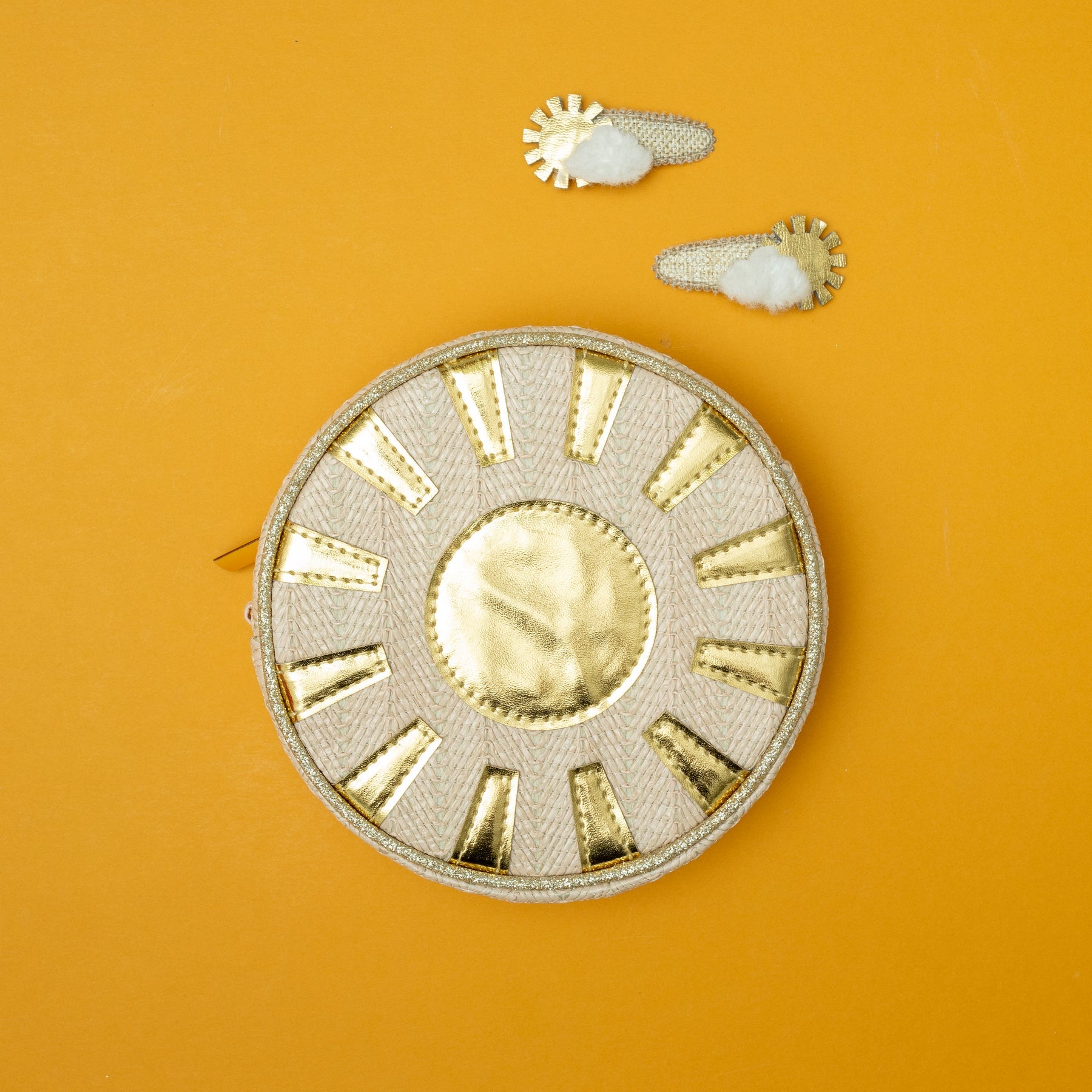 - Adorned with metallic gold fabric sunshines overlaid with a fluffy white cloud