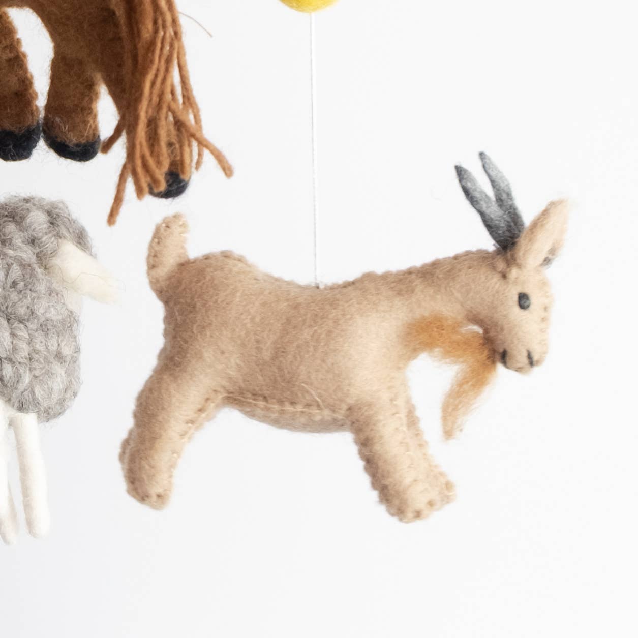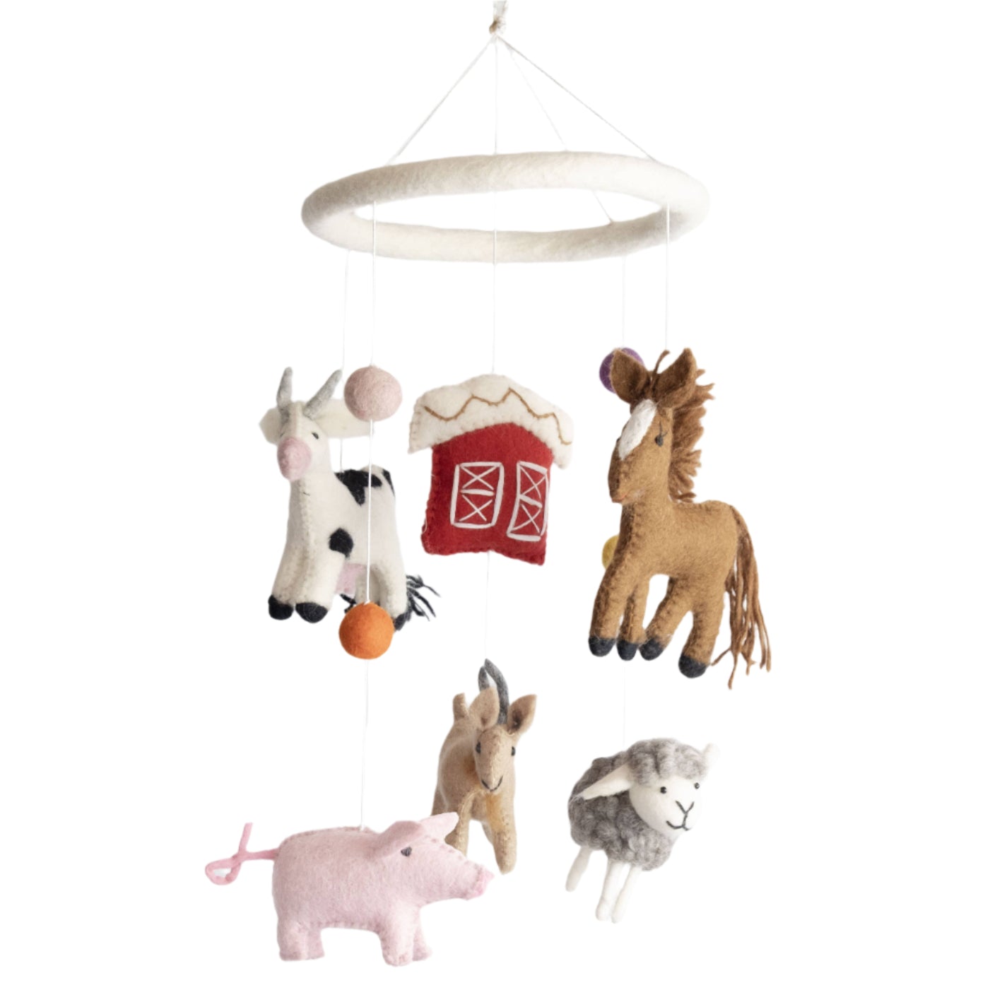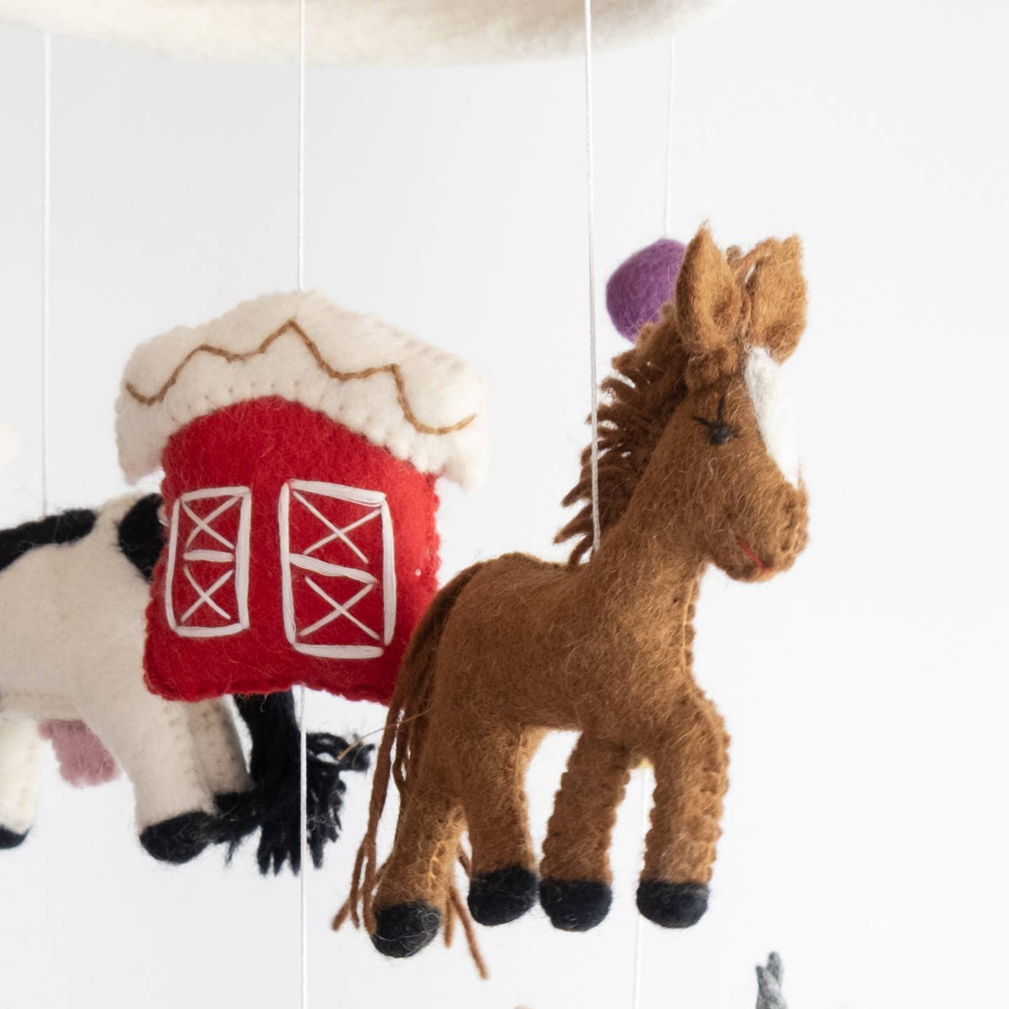 These barn mobiles are approximately 25" high x 7.5" across. Made from 100% natural wool; no harsh chemicals are used during production. The Winding Road's mobiles are handmade in Nepal in their family-owned workshop that follows fair trade practices.