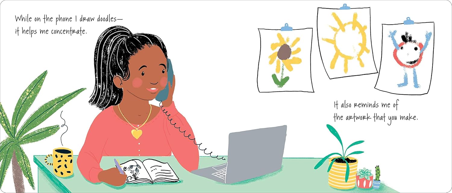 This is what a mother tells her child as she leaves for work each day. This lovely board book perfectly captures the sentiment that many women feel about being a working mom. The lyrical text takes us through a mother’s day away, showing us that although she’s working hard, her child is always on her mind and always in her heart.