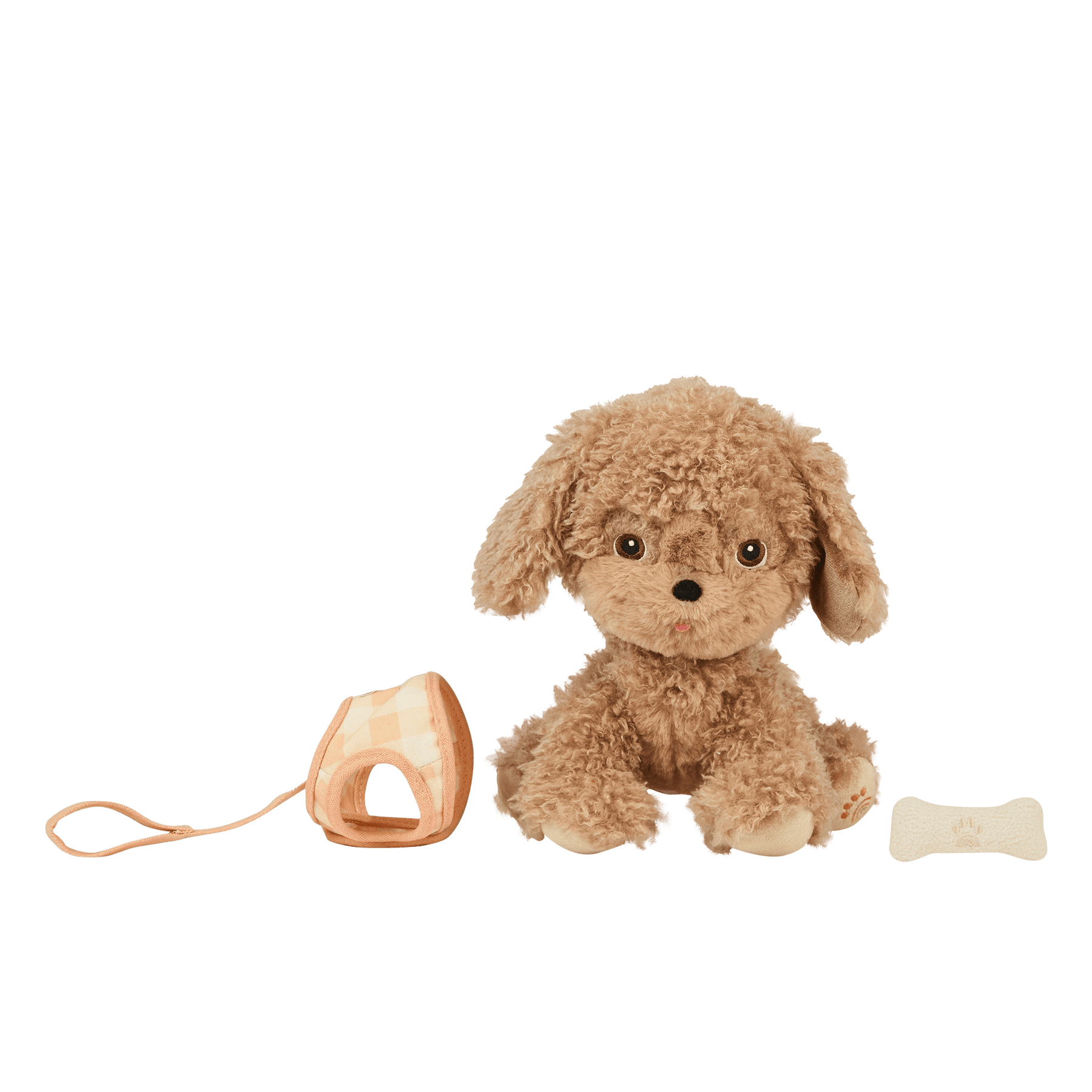 • Goldie comes with a removable canvas harness, lead, and bone treat.