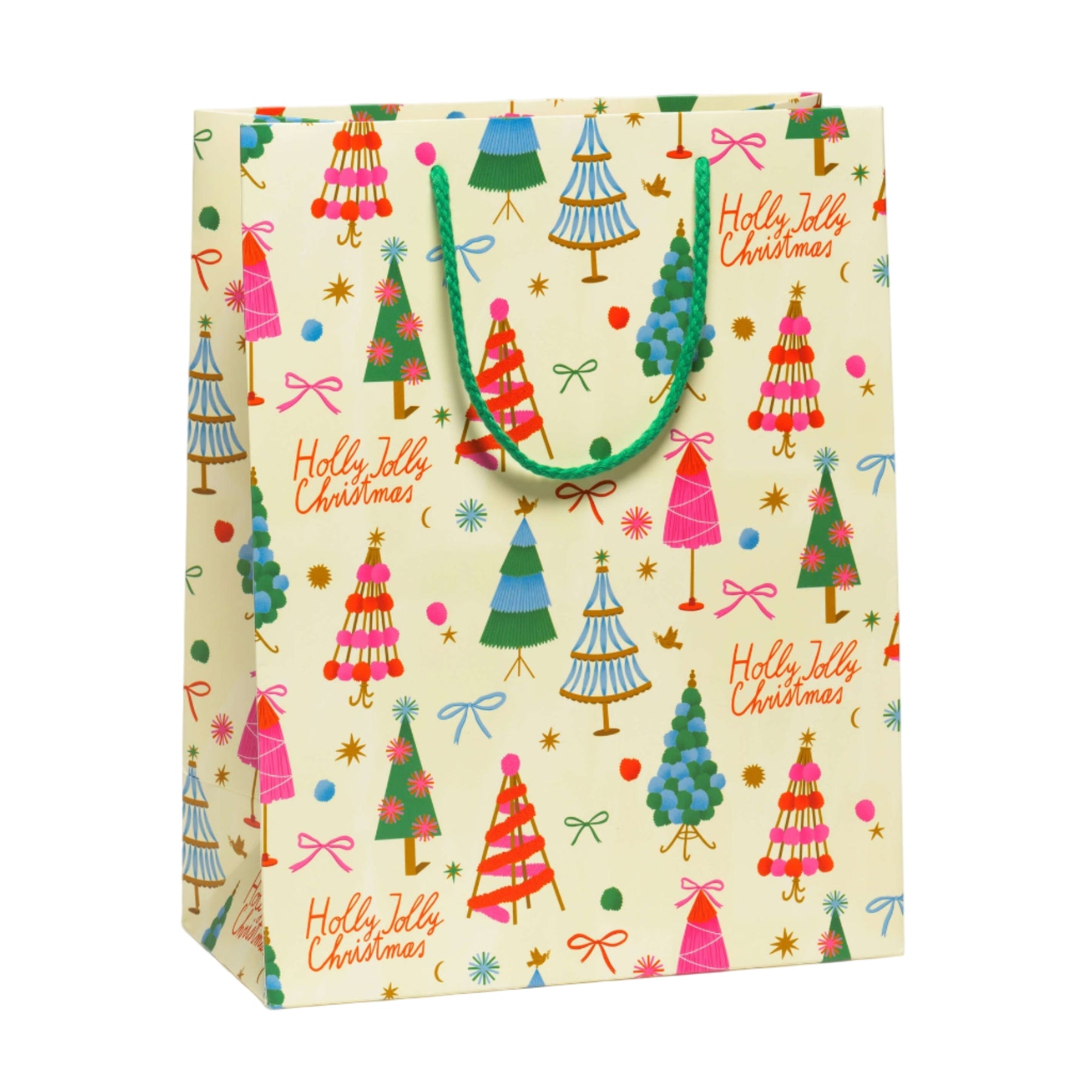 Spread holiday cheer with the Holly Jolly Trees Gift Bag by Red Cap Cards! Featuring colorful, whimsical Christmas trees, this large bag is perfect for packing up presents for friends and family.
