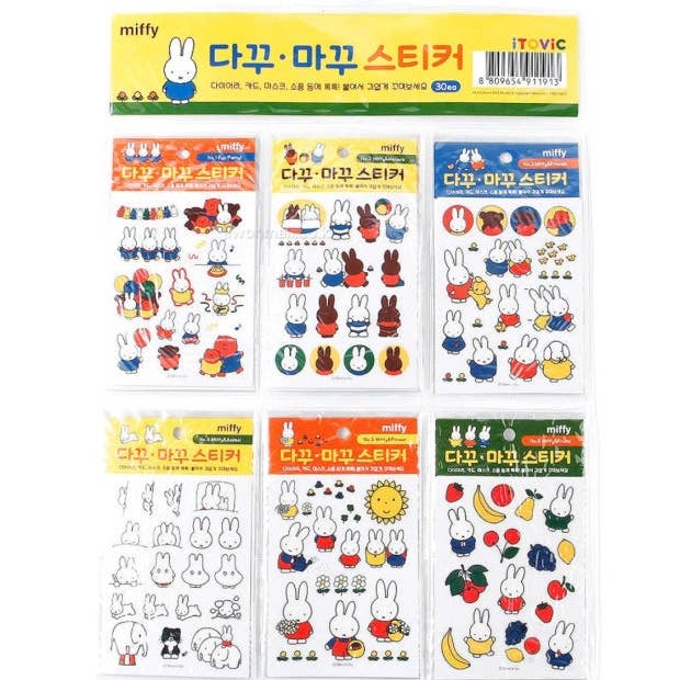 - Contents: 6 different sticker sheets (various designs including fruits, balloons, flowers, sun, Miffy in red dress, and more)
