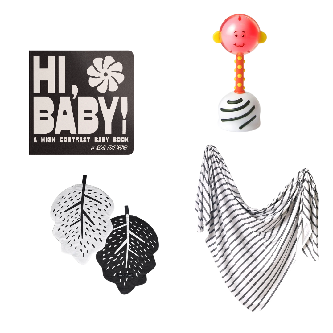 'Hi Baby!' High Contrast Baby Book: A simple, black-and-white contrast book built for newborn eyes. Its bold graphics and easy-to-follow shapes make it a calming, attention-grabbing read for baby’s earliest days.