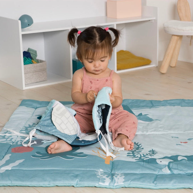 Two-sided soft book from Little Big Friends — vivid ocean-theme visuals on one side, interactive games and surprises on the other.