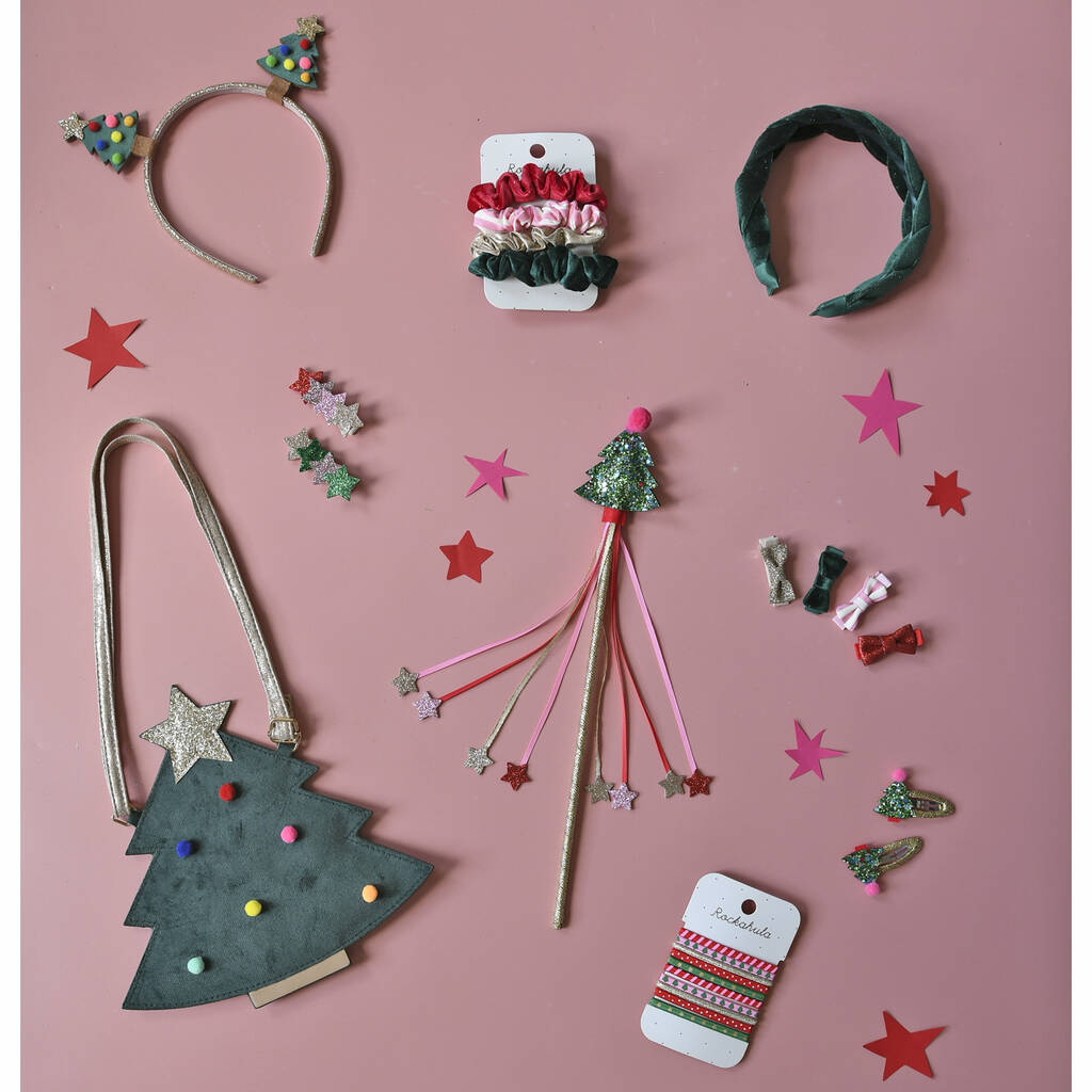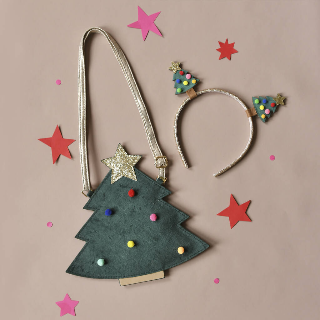 Festive tree charm — soft velvet shaped like a Christmas tree, topped with a glittering star and bright pom-pom decorations for a merry look.