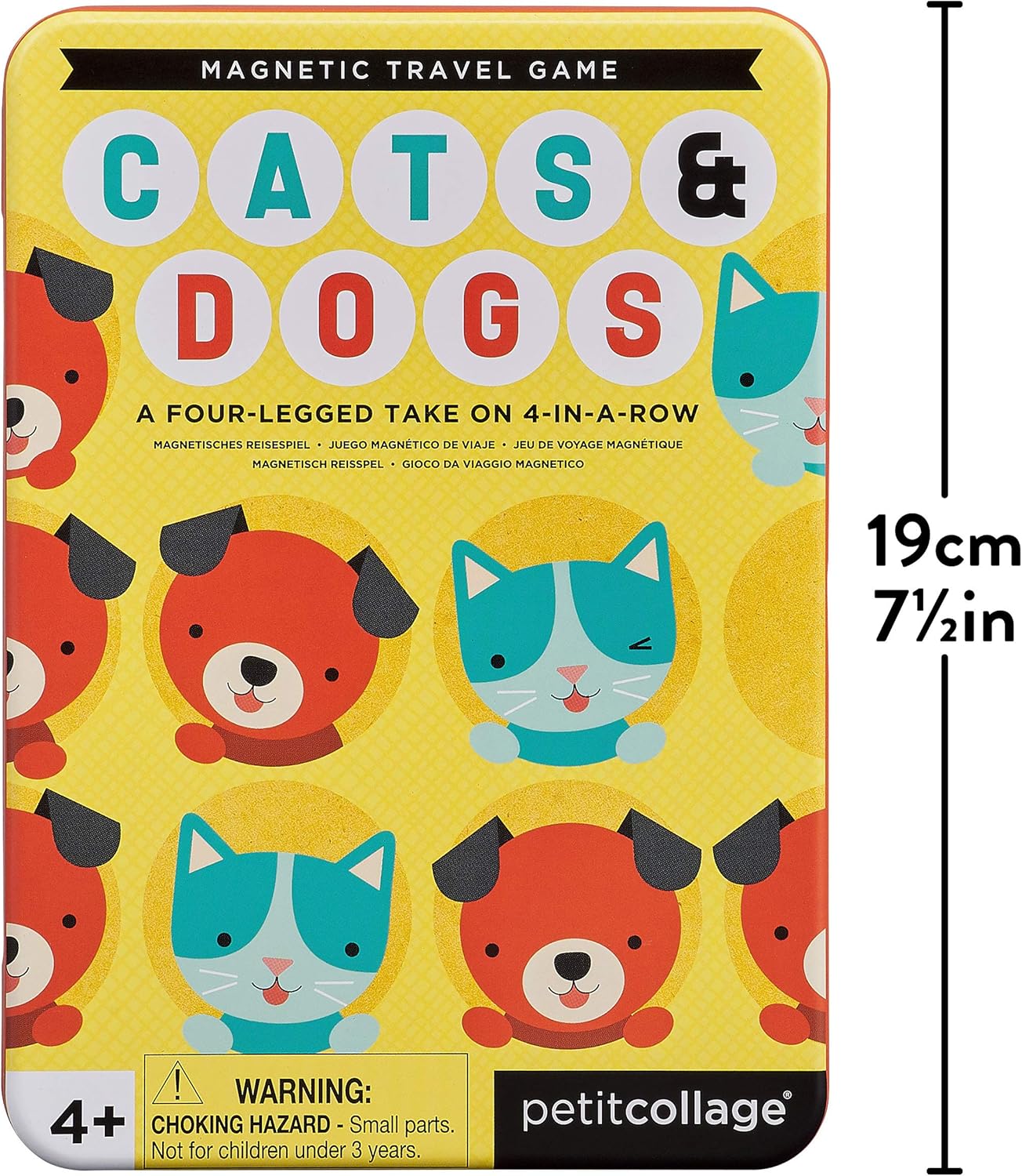 It's cats vs dogs in this four legged take on four in a row! Try to get four of your animal friend in a row to win in this Cats & Dogs Magnetic Travel Game from Petit Collage.
