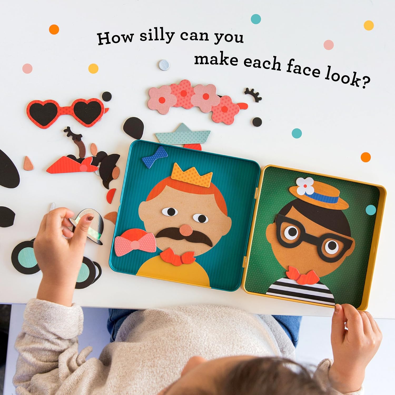 Petit Collage Funny Faces On‑the‑Go Magnetic Play Set – over 25 goofy magnetic pieces like hats, glasses and mustaches let kids create 100+ silly face combos for endless laughs.
