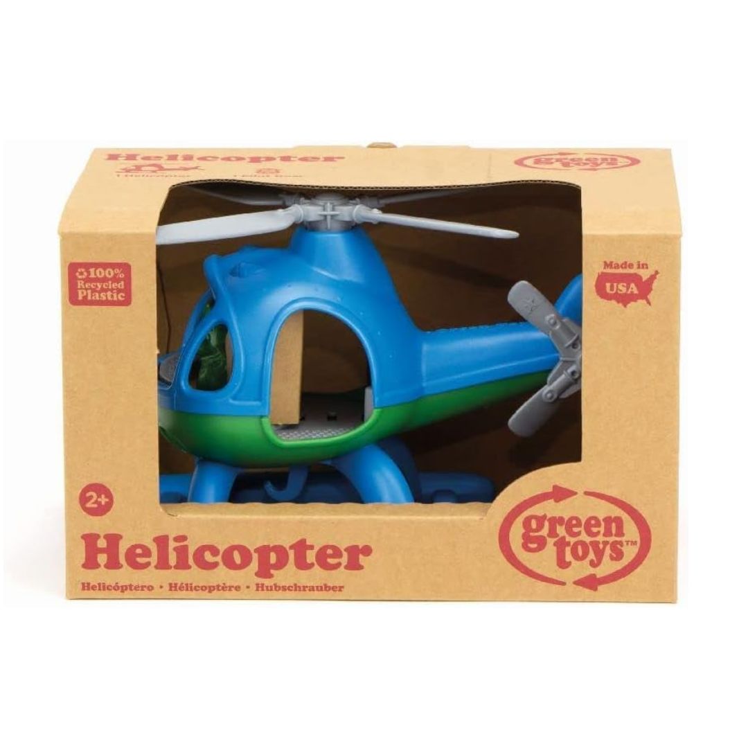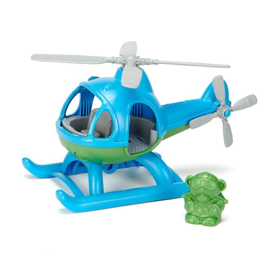 Up, up, and away! The high-flying Green Toys Helicopter is ready for action! This eco-friendly chopper is made from 100% recycled plastic that saves energy and reduces greenhouse gas emissions, and features two spinning rotors and sleek skids on the bottom for easy landings. The Helicopter includes a pilot bear figure that fits perfectly in the spacious cockpit that's complete with a full dashboard and the Green Toys' signature 8-track.
