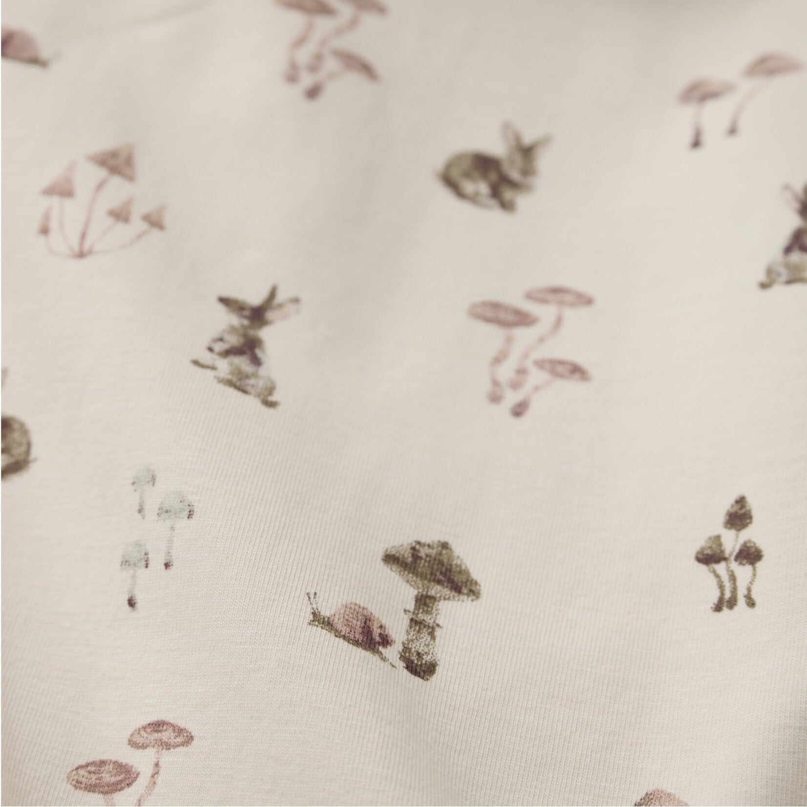 This long-sleeve bodysuit by Minymo comes in a soft, light beige ("sandshell") shade and features an adorable print of rabbits and mushrooms in muted tones.It has a round neckline finished with fine trim, and practical snap (push-button) closures at the bottom and on both shoulders, making dressing and undressing easier.