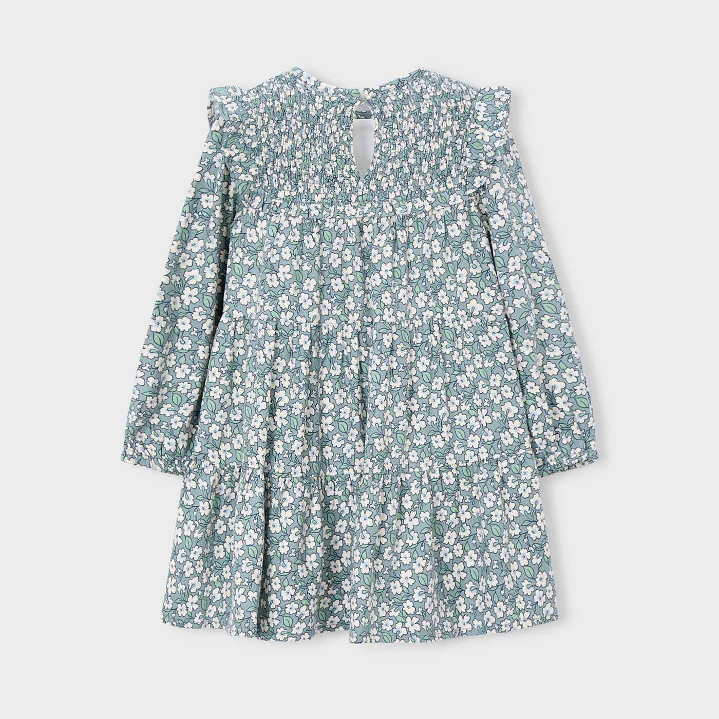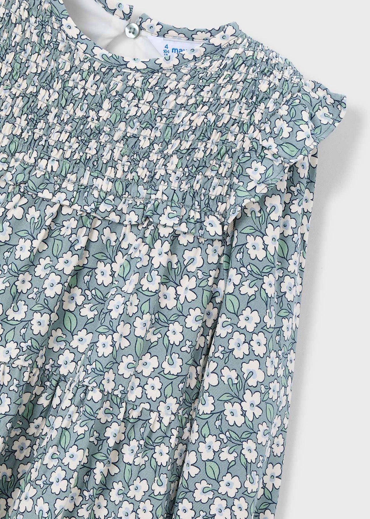 Dress with long sleeves for girls with ruffles on the shoulders. Round neckline. Single button fastening. Warm fabric, ideal to wear on the coldest days. This model has honeycomb detailing. Gathered design. Patterned design.