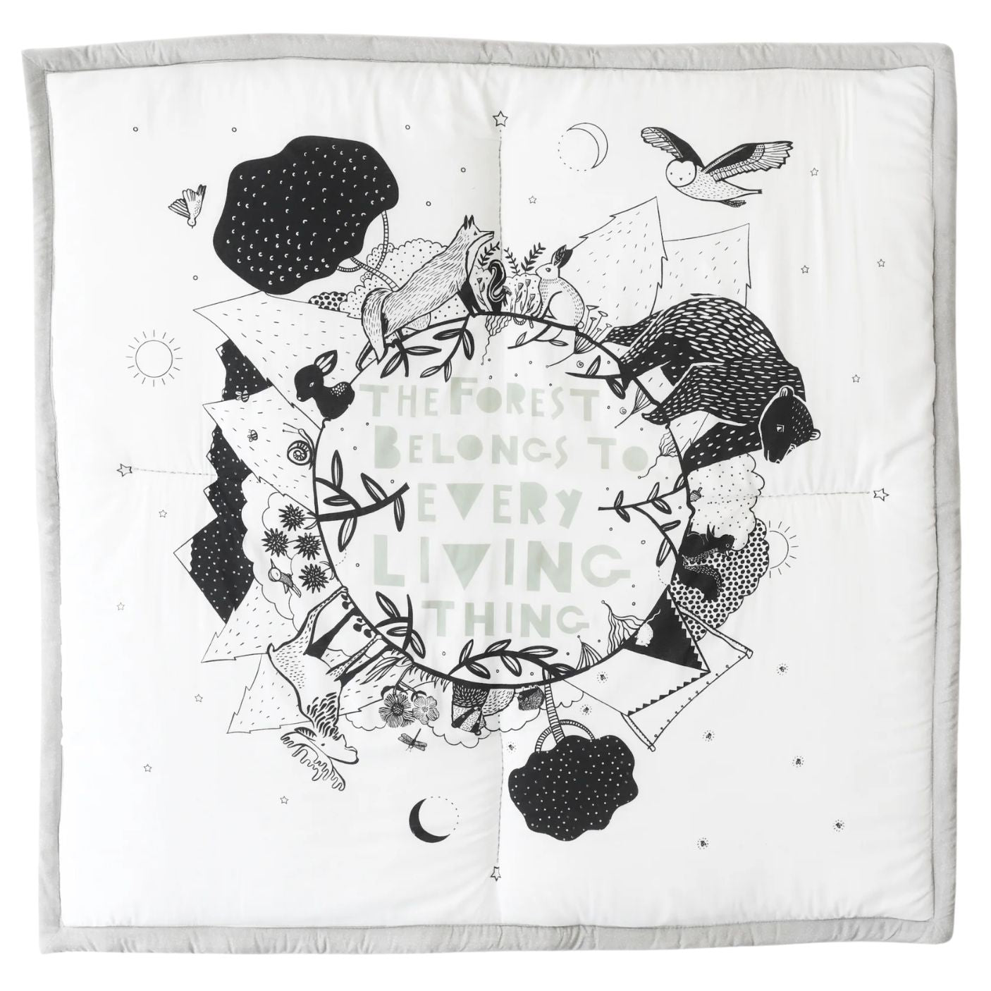 This reversible playmat features friendly forest animals on one side and an enchanting woodland pattern on the other. Made in India using organic traditional fabrics. The outer fabric is a double layer of organic voile, making it super soft, and a poly-fiber stuffing that makes it machine washable for convenience. High contrast graphics and reversible two-sided pattern make it ideal as a playtime setting for baby development.