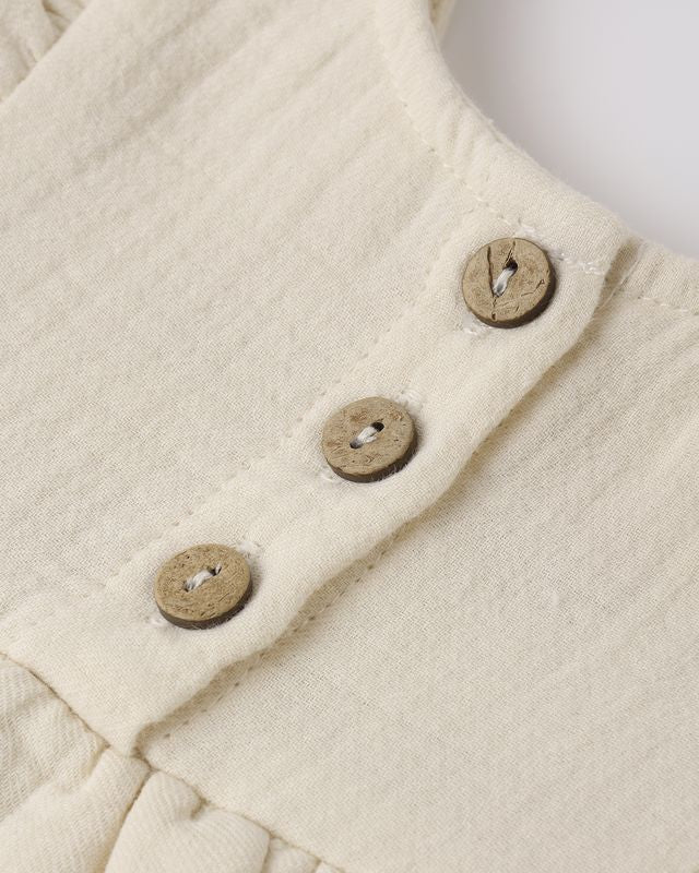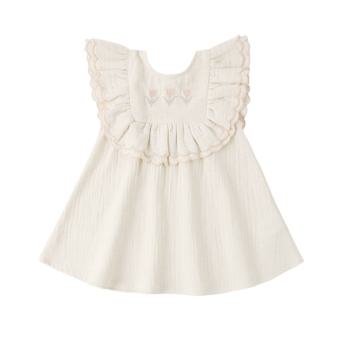 Quincy Mae's Lulu Dress is perfect for your springtime occasions. Featuring a gathered ruffle with merrowed edge detail along the chest with tulip embroidery and buttons on back for easy changes.