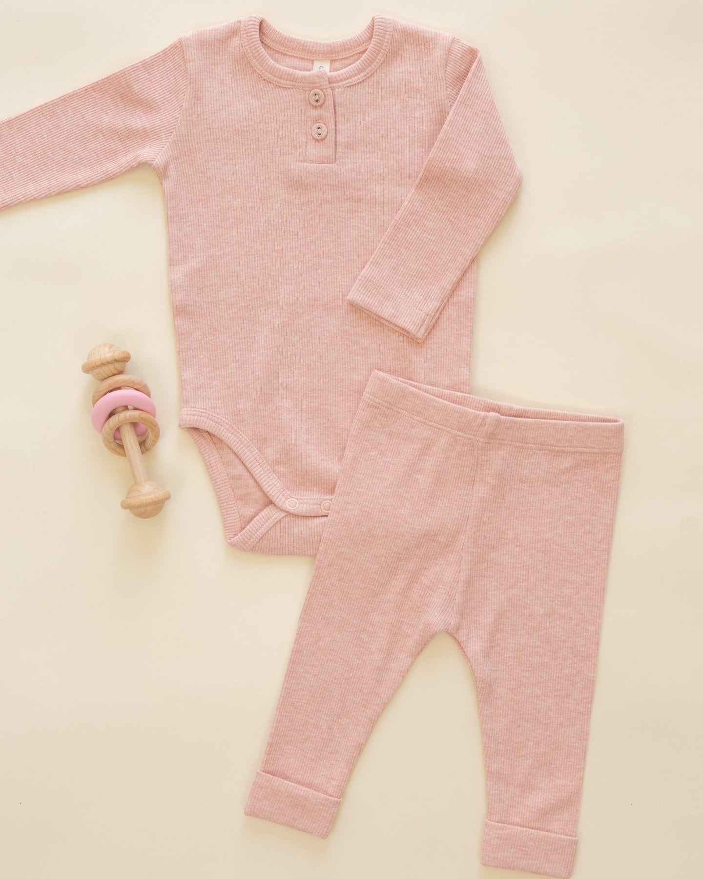 Quincy Mae's Henley Long Sleeve Bodysuit, made from ribbed melange knit, features a two-button placket at the center front and bottom snaps for easy changes. Pair with Ribbed Leggings to complete your little one's look.
