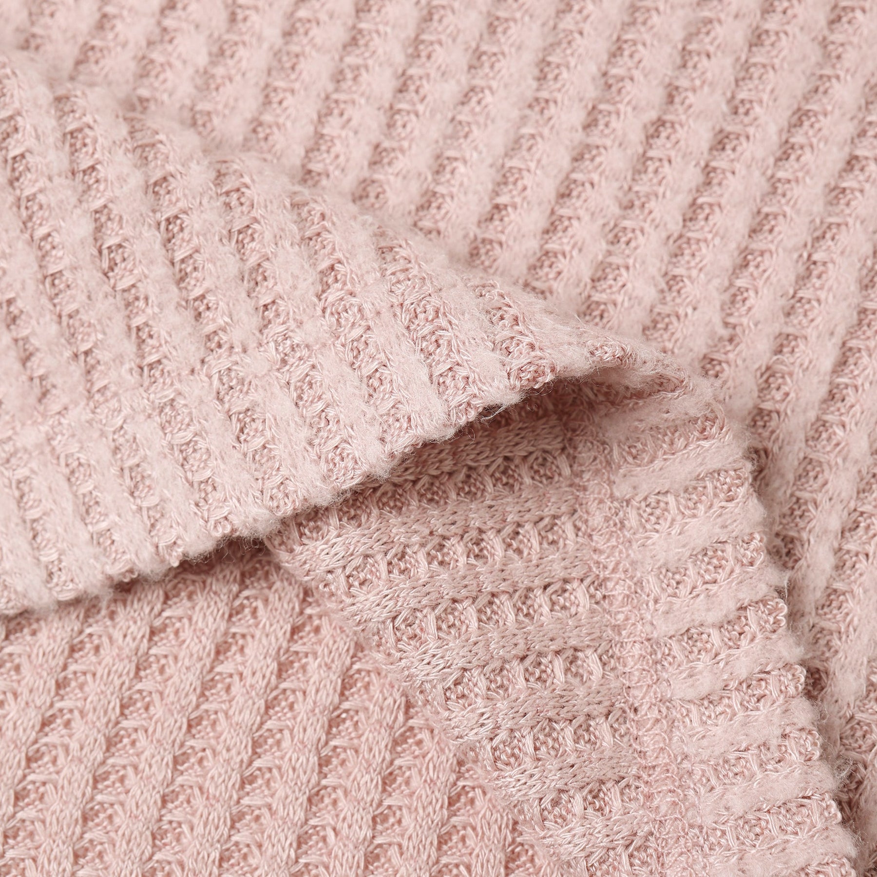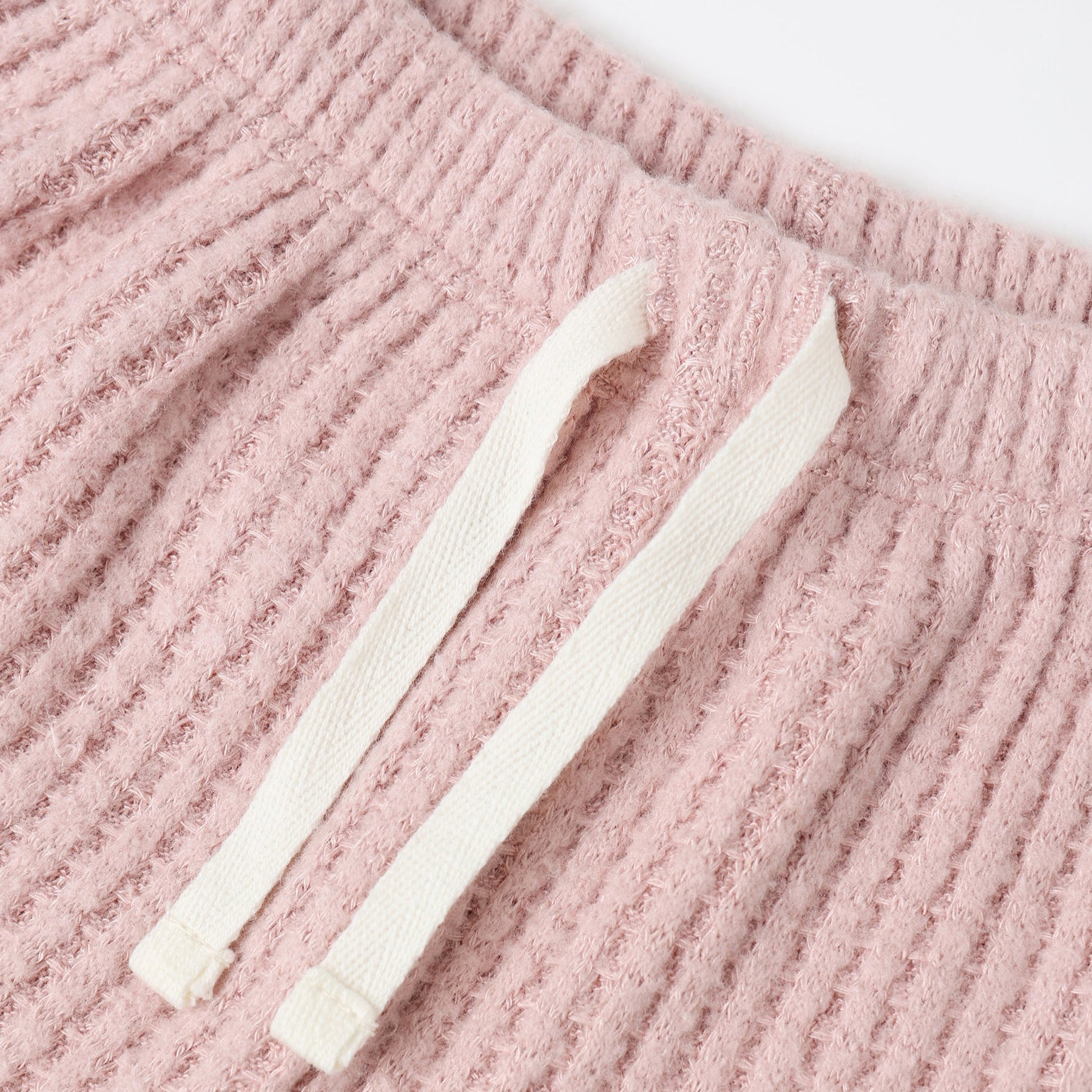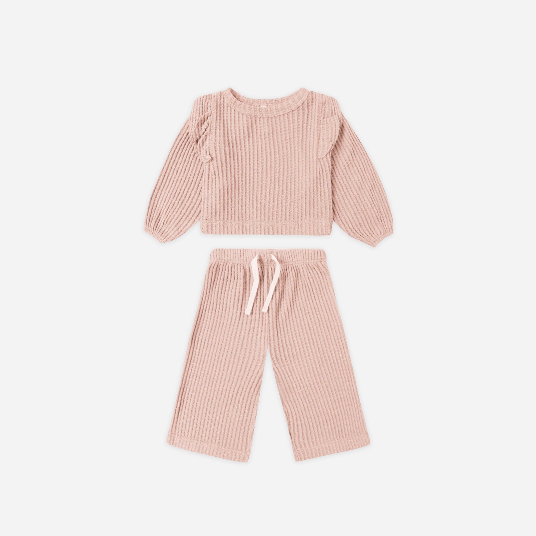 Made for cozy days, this darling set in Quincy Mae's fuzzy waffle knit includes a long sleeve top with ruffle shoulder detail and wide leg pants featuring an elastic waistband and fixed cotton drawstring.