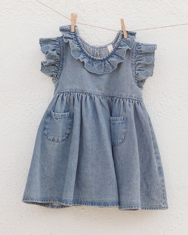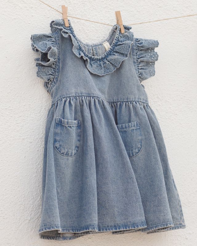 Quincy Mae's Sophie Dress features a beautiful collar and ruffle sleeves with eyelet detail, and cute front pockets. Matching bloomers included in all sizes. Welcome blue skies in this summery style.