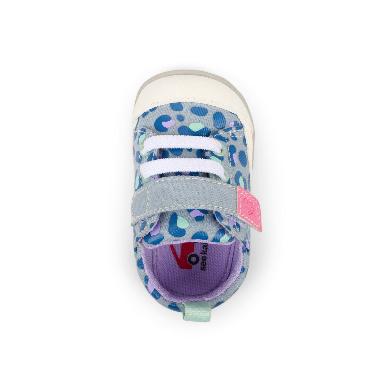 • Sky blue cotton denim upper with exclusive See Kai Run leopard print and stitched natural rubber toe cap for added protection.