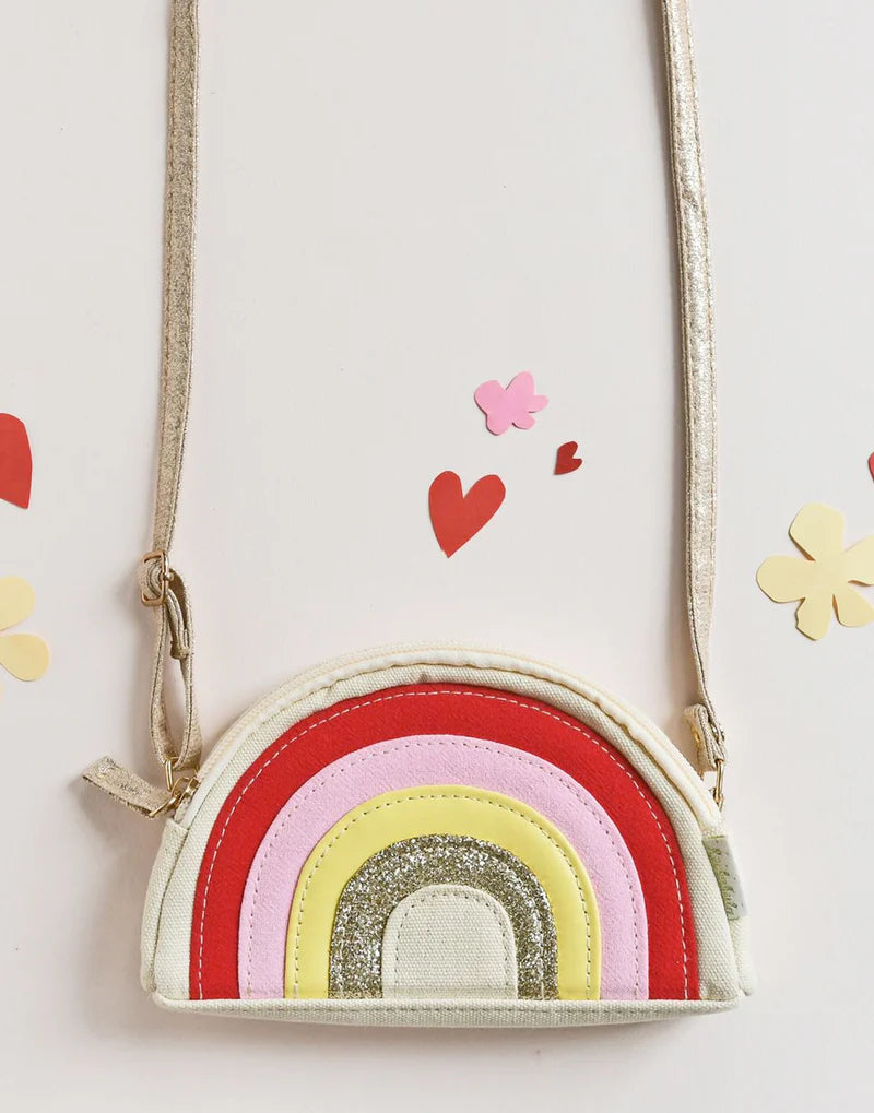 Bring on the summer vibes with the Rockahula Kids cheery rainbow bag! In a palette of bright colors complemented with shimmering gold glitter, this bag is fully lined with a gold foil heart fabric and features a zip closure and a gold adjustable strap with a break point for safety.
