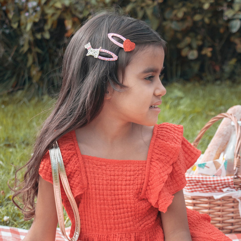 Rockahula Kids' sweet and playful Scottie dogs are the perfect companion for picnic adventures at the park! This pack of two adorable Scottie dogs feature lots of gold glitter and a little pink collar. Each one is secured to a pink spotty grosgrain wrapped snap clip.