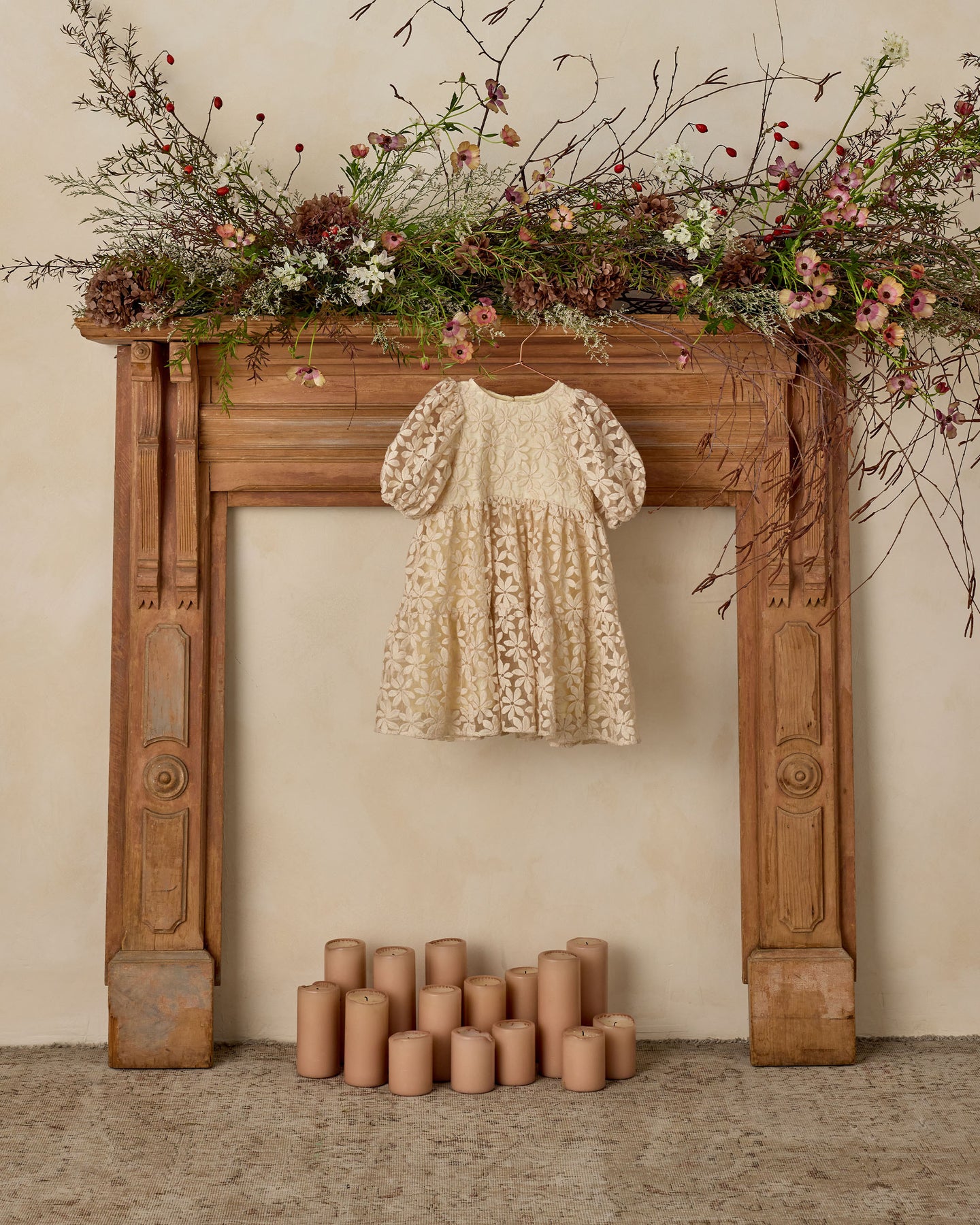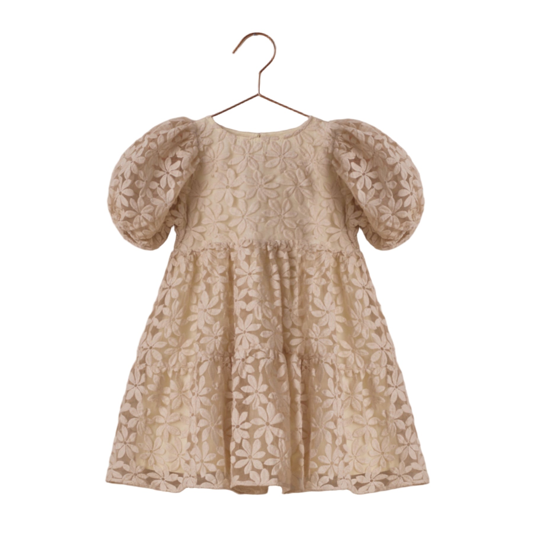 This dreamy, midi-length dress features a layered tiered skirt, full puff sleeves, and a delicate teardrop back closure, perfect for your special occasions.