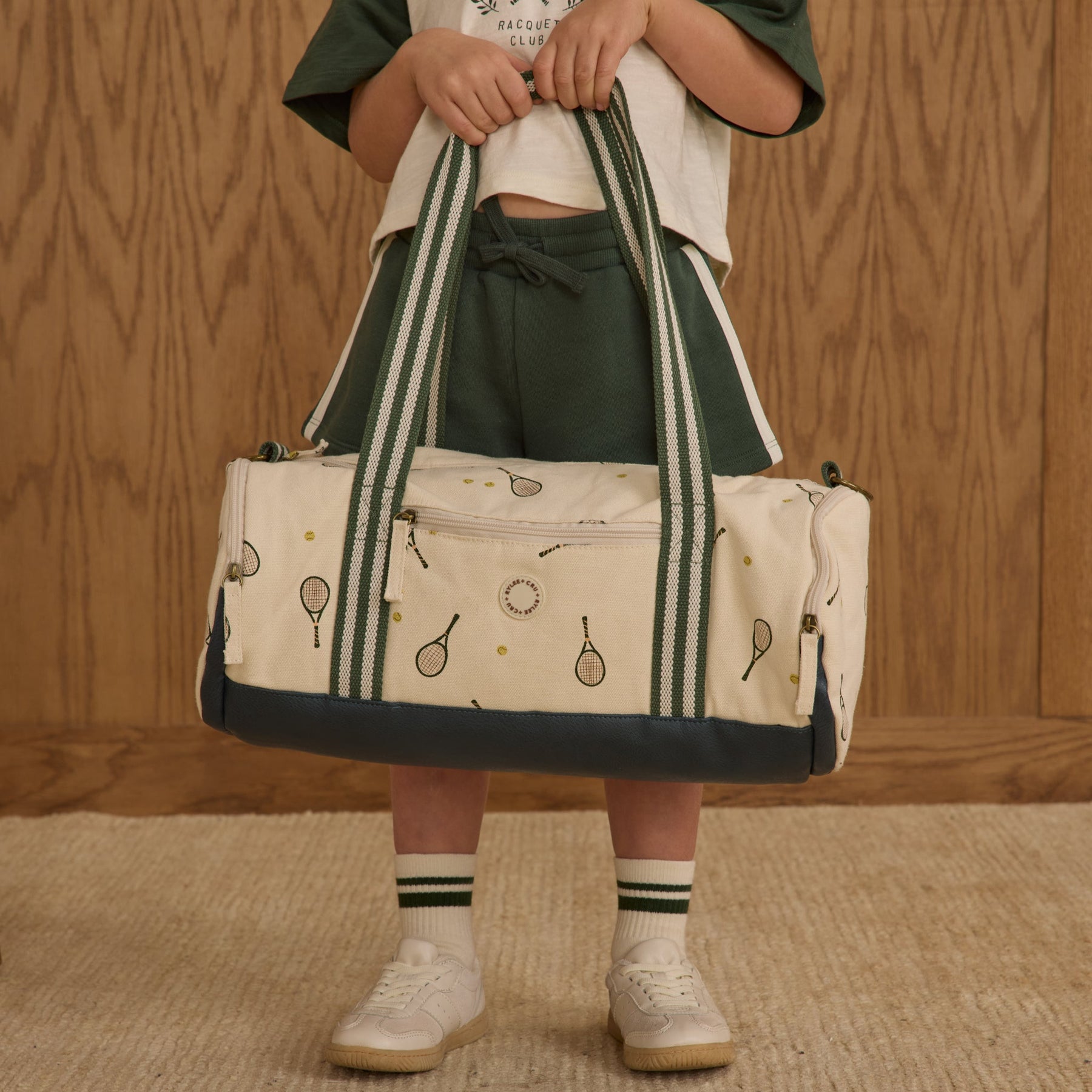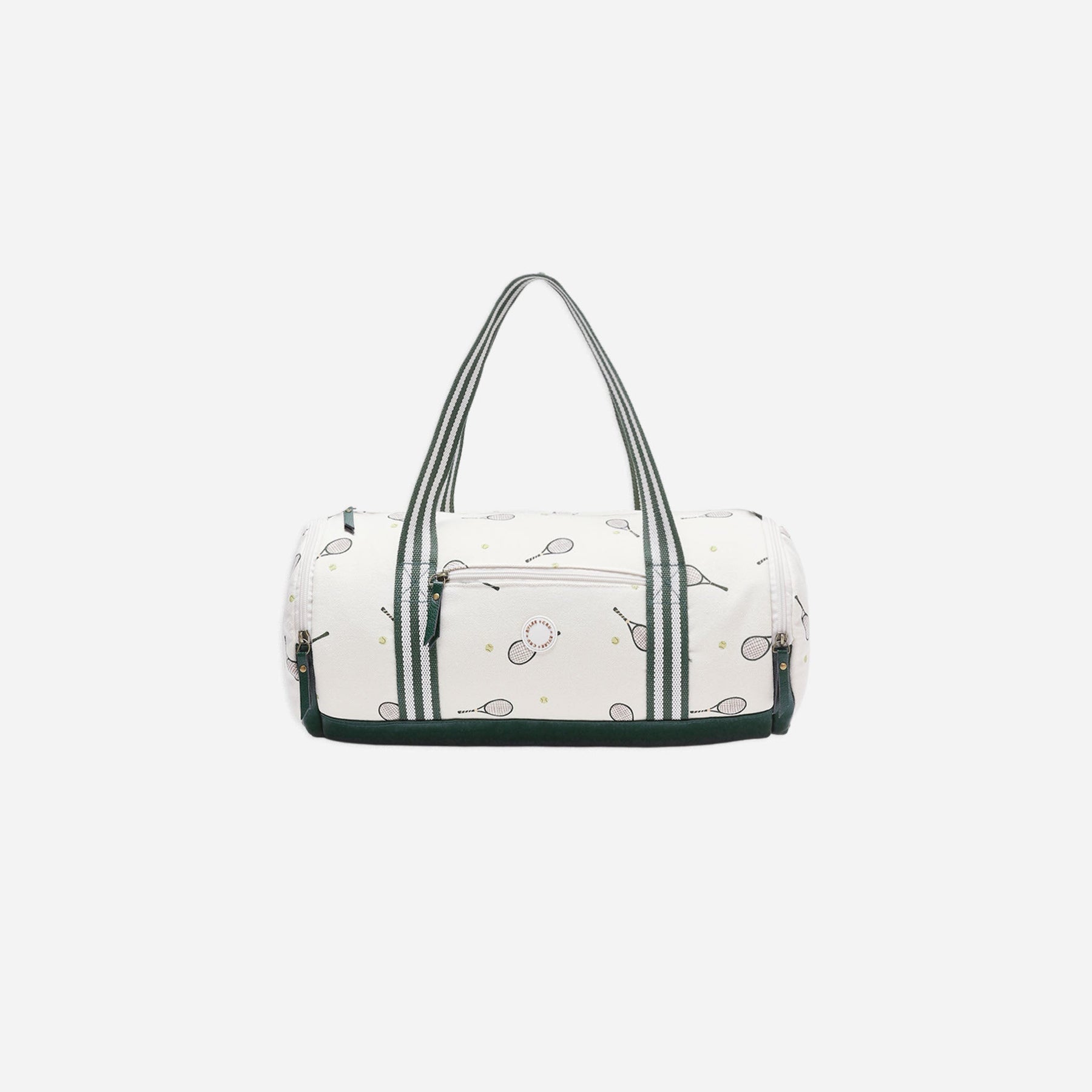 The Rylee + Cru Duffle Bag features a spacious main zip compartment, front and side zip pockets, a removable shoulder strap, and contrast striped handles. Finished with a stain- and water-resistant bottom panel for extra durability making it perfect for practice, tournaments, or weekend trips.