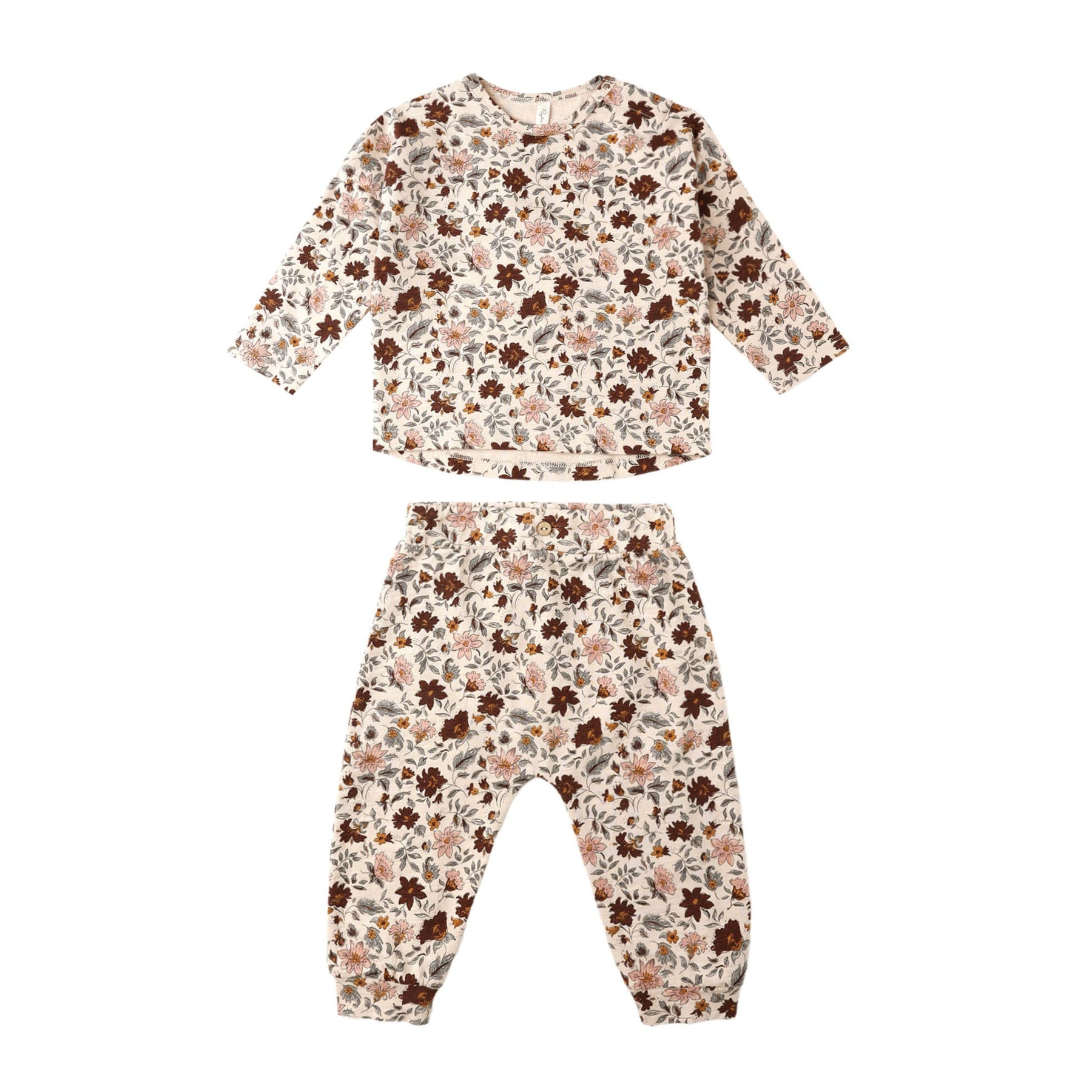 This comfortable cotton jersey set includes a relaxed long sleeve crewneck tee and dropped-crotch slouch pants. Shoulder snaps included on sizes 0–3M - 6–12M for easy changes.