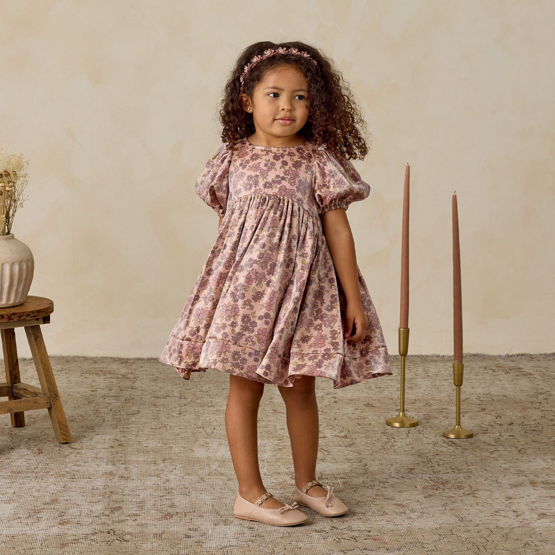 The Luna Dress showcases a babydoll-inspired silhouette with sweet puff sleeves, a gently curved waistline, and two faux shell buttons at the back for a delicate finishing touch. Crafted from Noralee's metallic Tencel fabric, it adds a subtle shimmer perfect for special occasions.