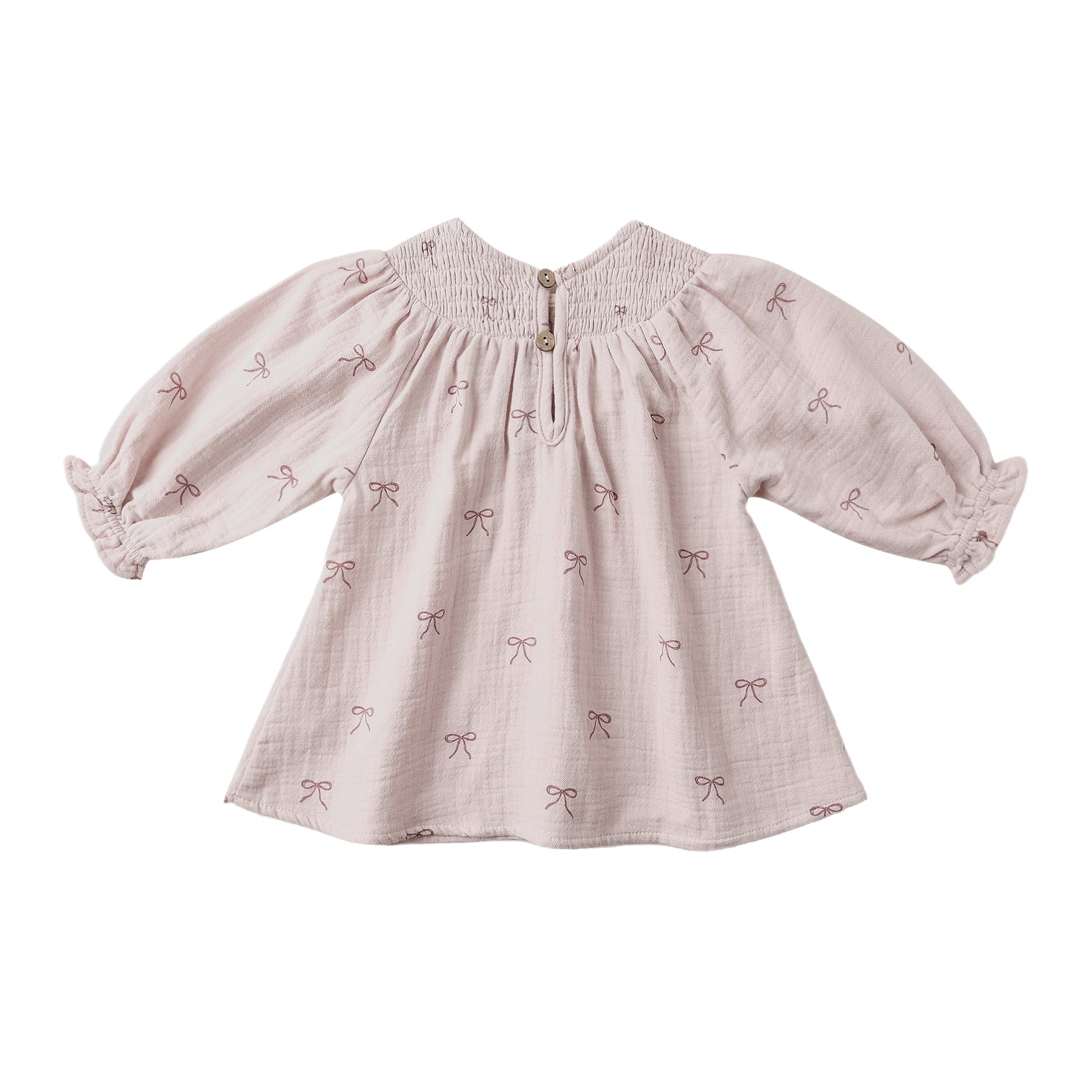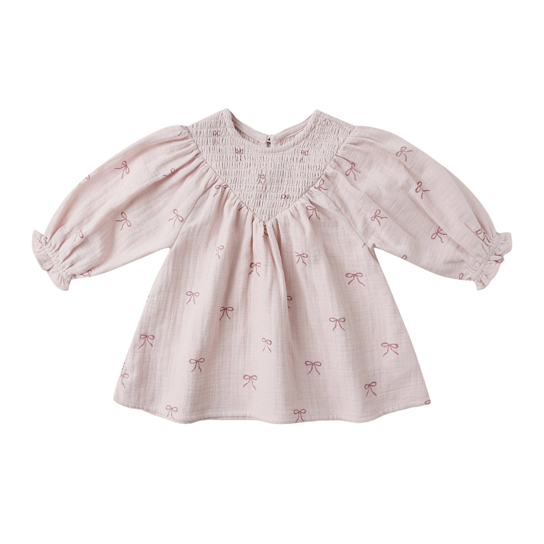 This sweet long sleeve dress features a v-shaped smocked neckline, ruffle sleeves, and a button back closure for easy changes.