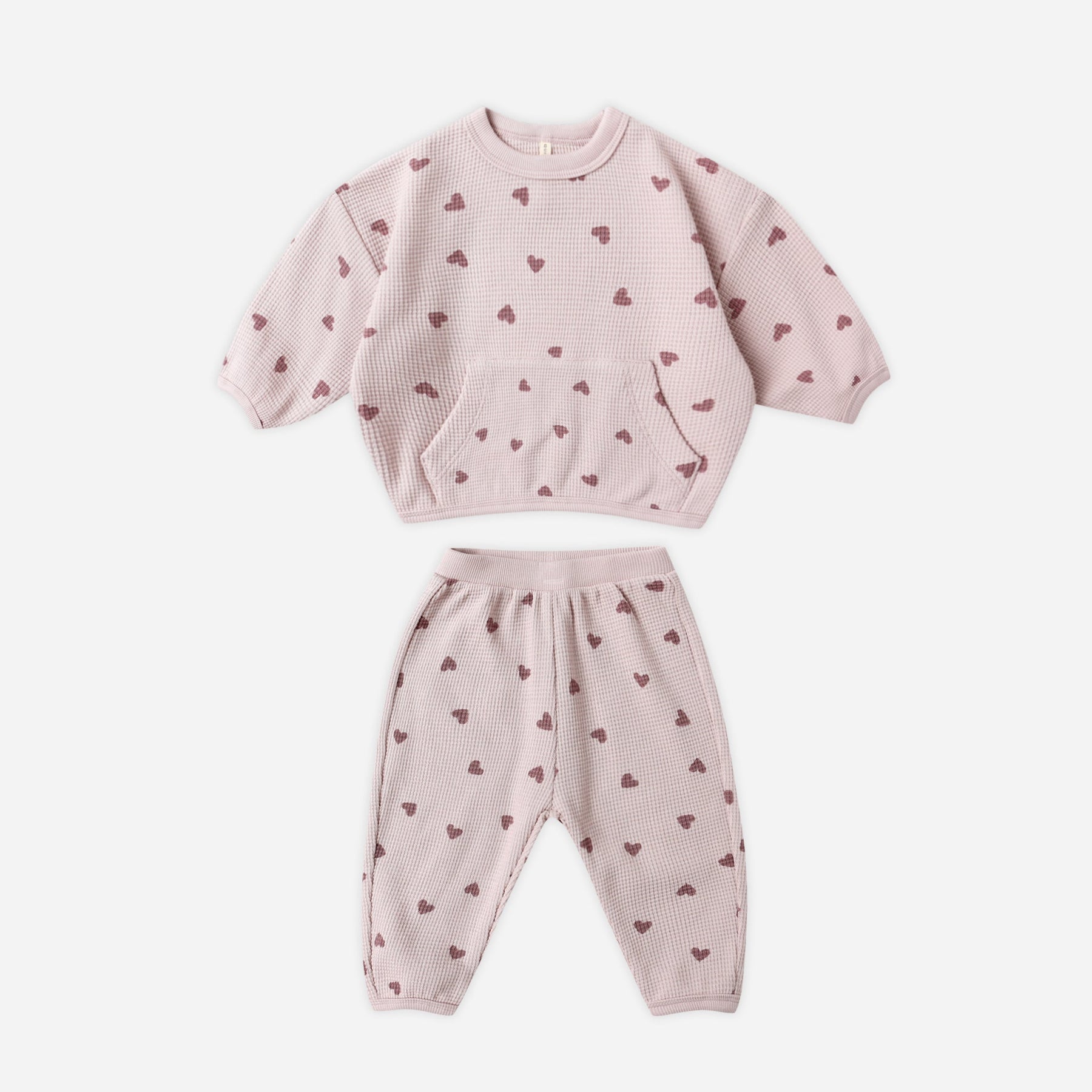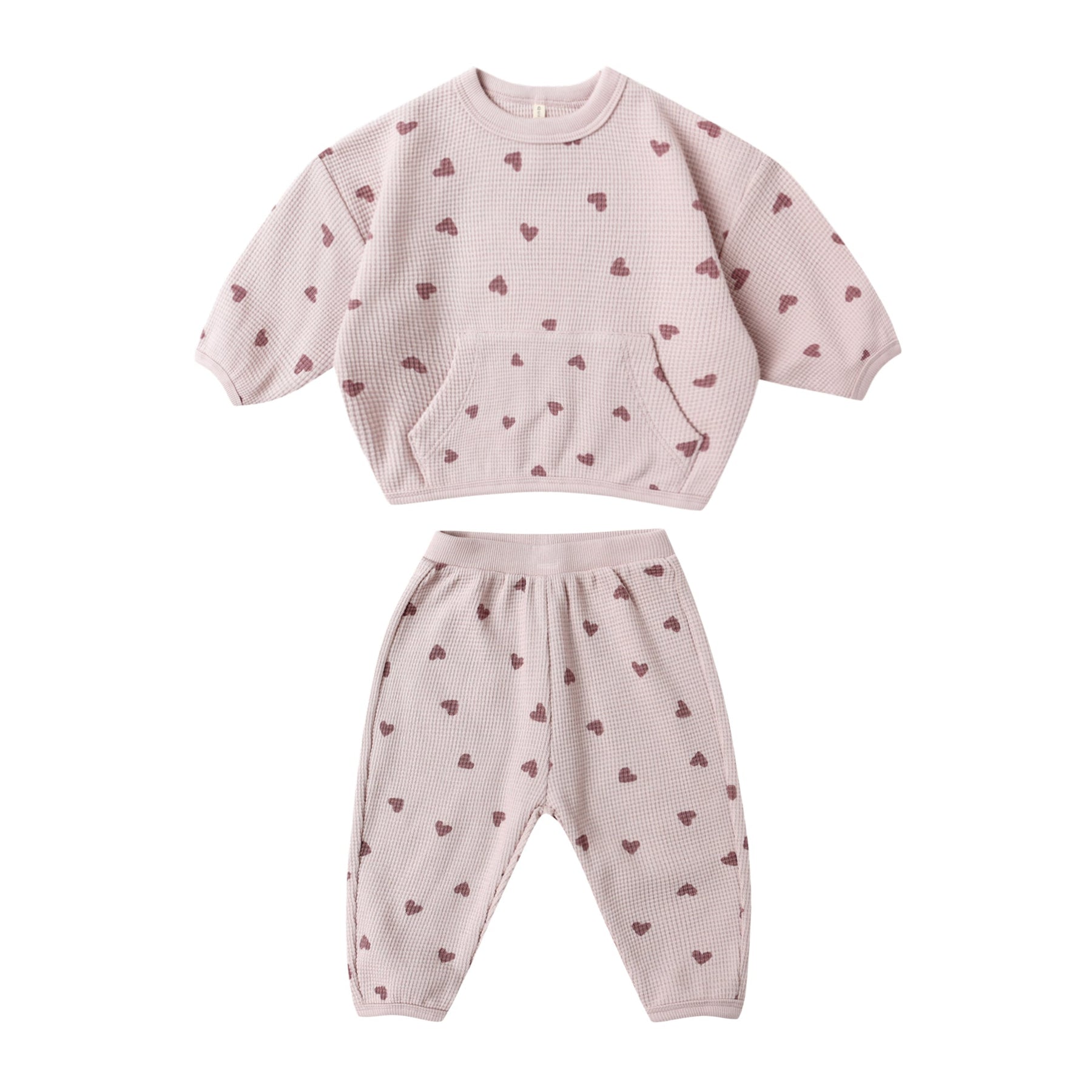 The Quincy Mae Waffle Slouch Set includes a long sleeve top with a large front pocket and matching pants—perfect for lounging and play.