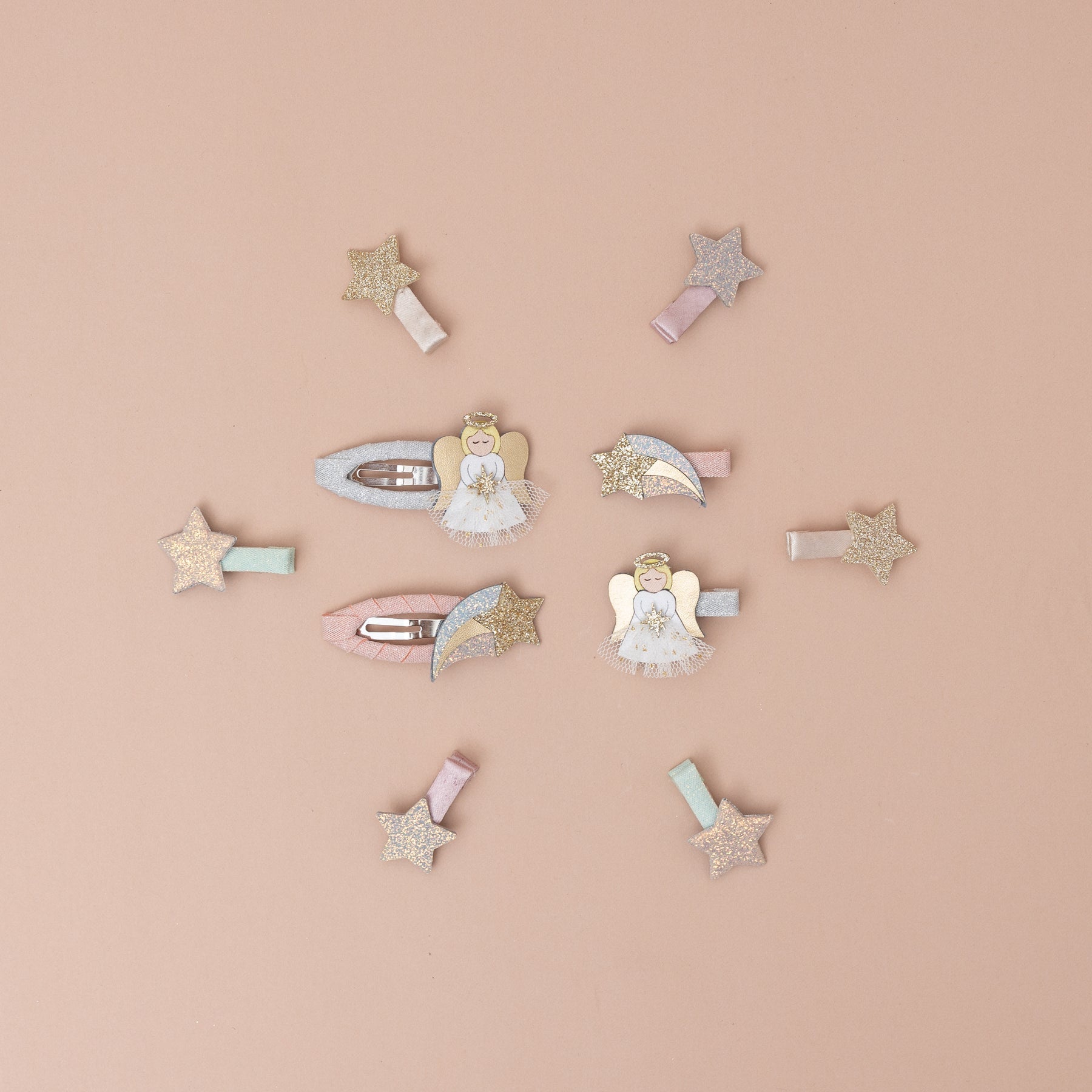 Eight sparkling angel — themed clips ready for festive hair moments.