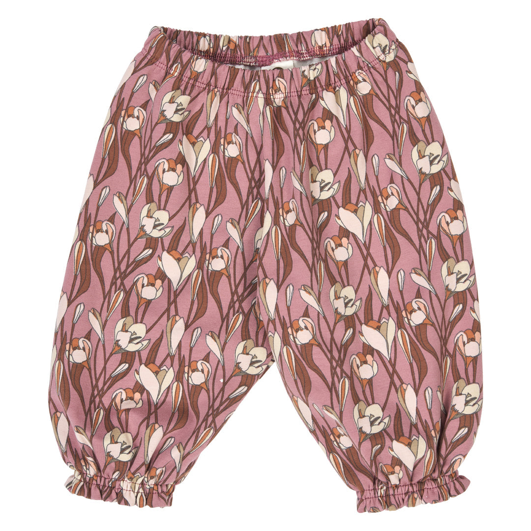 Beautiful feminine pants with a beautiful all-over floral print. The pants are loose and wide in fit, and there is elastic at the end of the legs and at the waist. Made in soft and stretchy thin sweat quality with elastane and with a brushed inside. The brushed inside makes the trousers super nice and soft to wear.