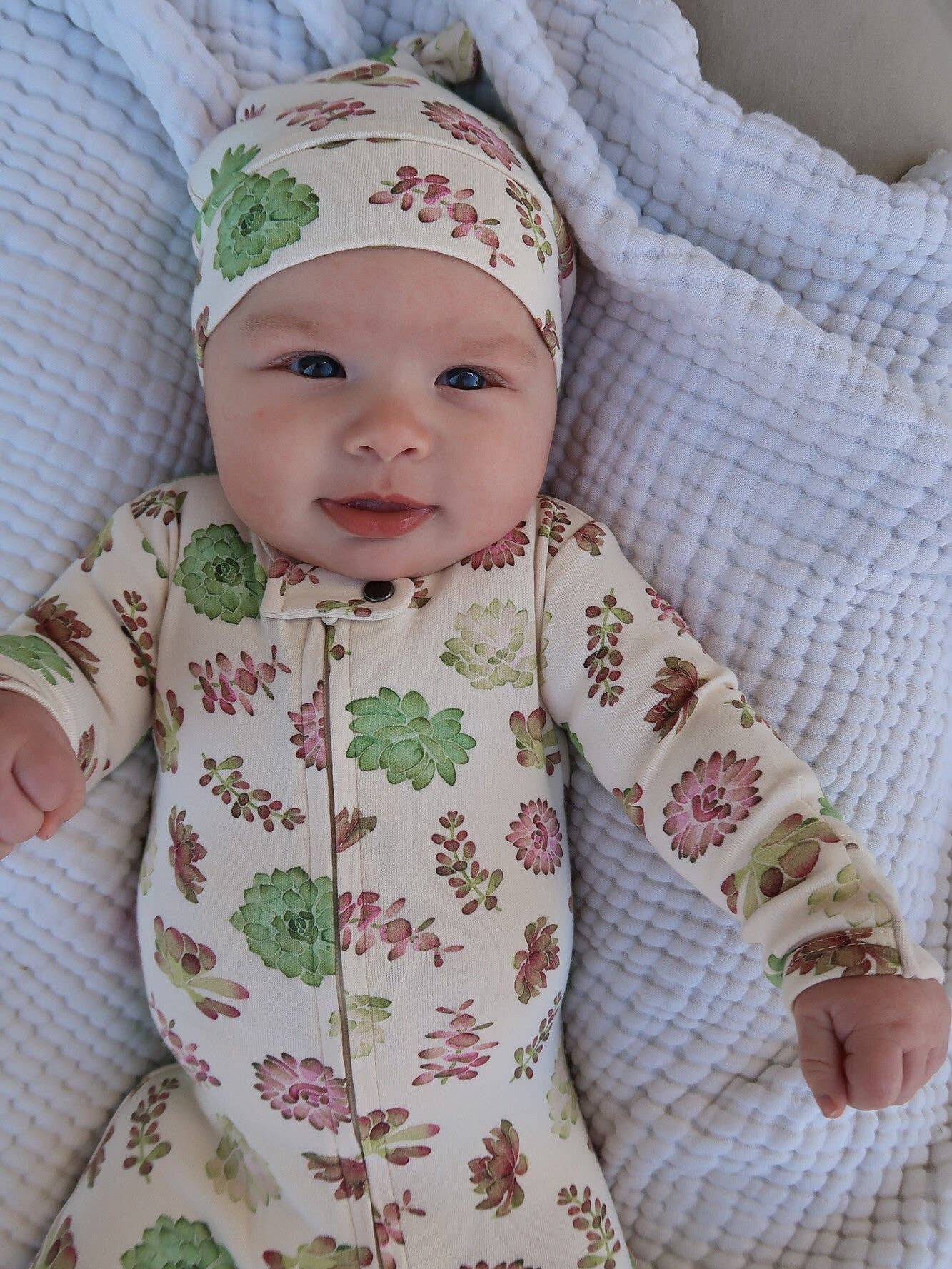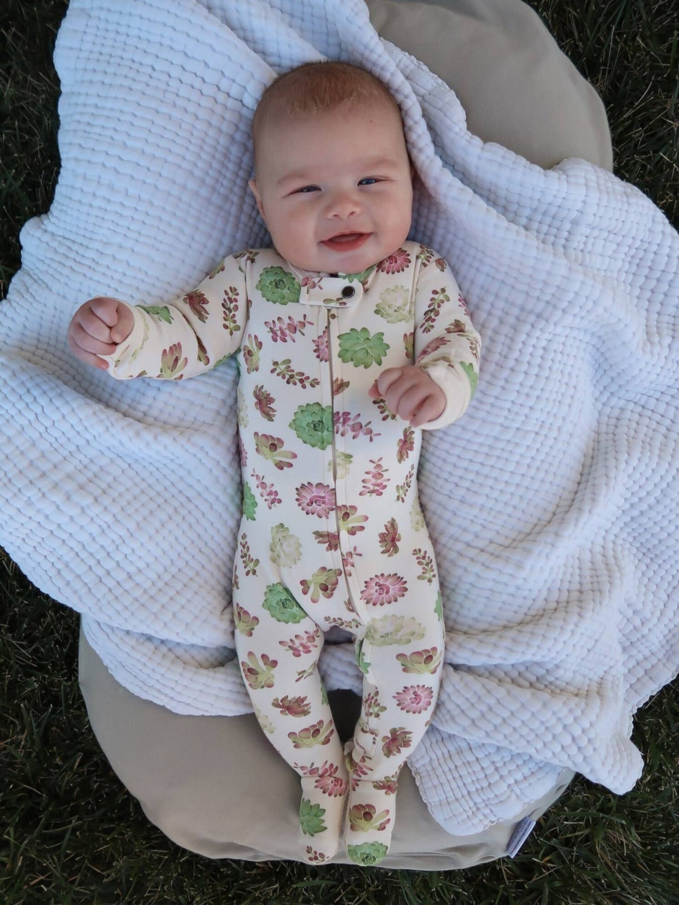 This charming footie in Buttercream Succulents by L'ovedbaby combines softness and practicality for your baby's comfort. Crafted from 100% GOTS-certified organic cotton, it features a nature-inspired succulent print and a dual-direction zipper for easy dressing and diaper changes.