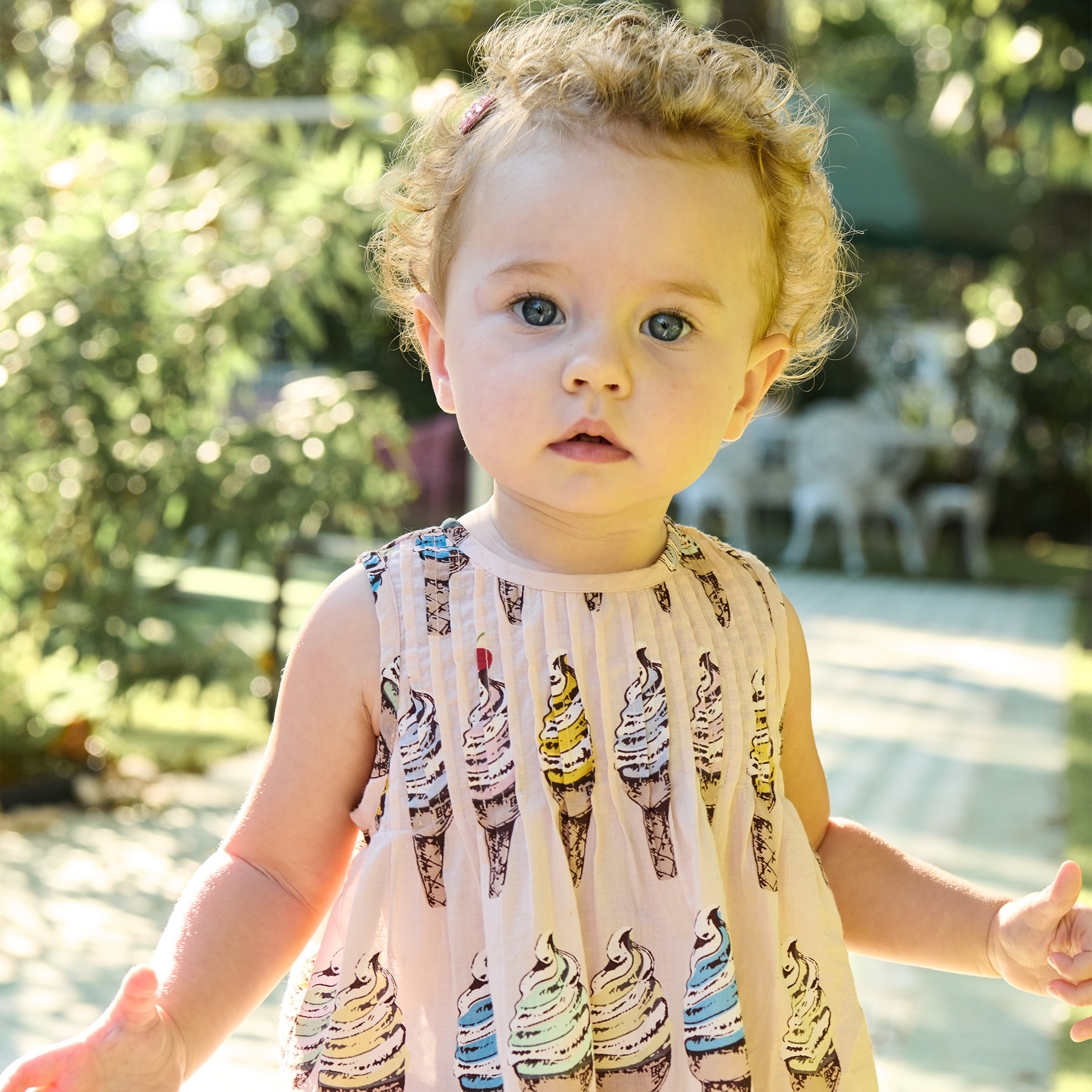 Sweet and playful with signature sparkle. The Jaipur 2-Piece Set in Pink Soft Serve features a cheerful print finished with silver glitter buttons for a polished touch. A red satin bow and red pearl stitching at the diaper cover leg openings add vibrant contrast and thoughtful detail. Designed for comfort and charm, this set is perfect for spring celebrations and everyday moments alike.