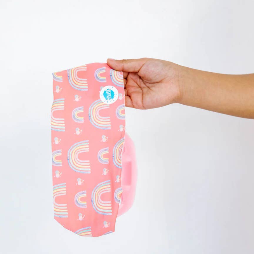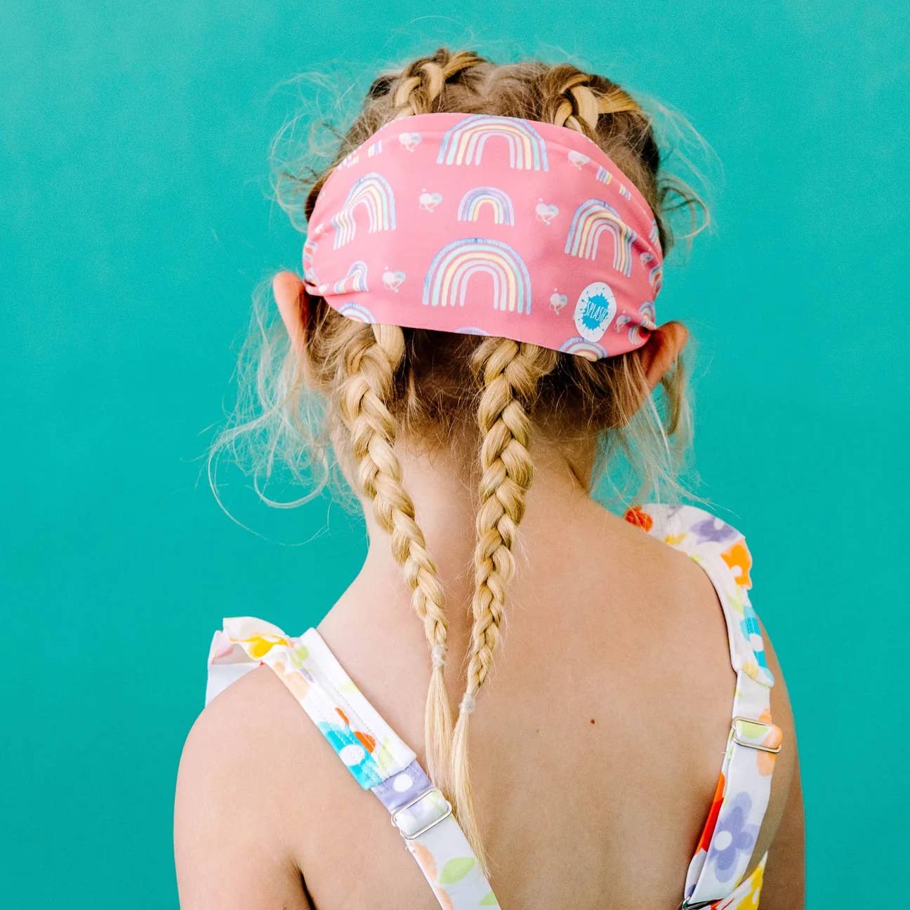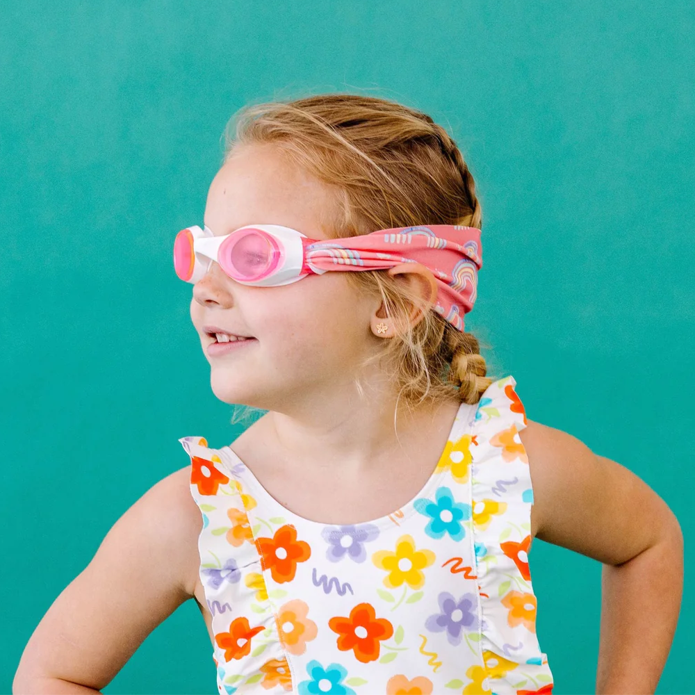 The Splash Place Over the Rainbow swim goggle features a tangle-free strap in a pretty pastel rainbow print on a pink background, paired with a white frame and lightly tinted pink lenses.