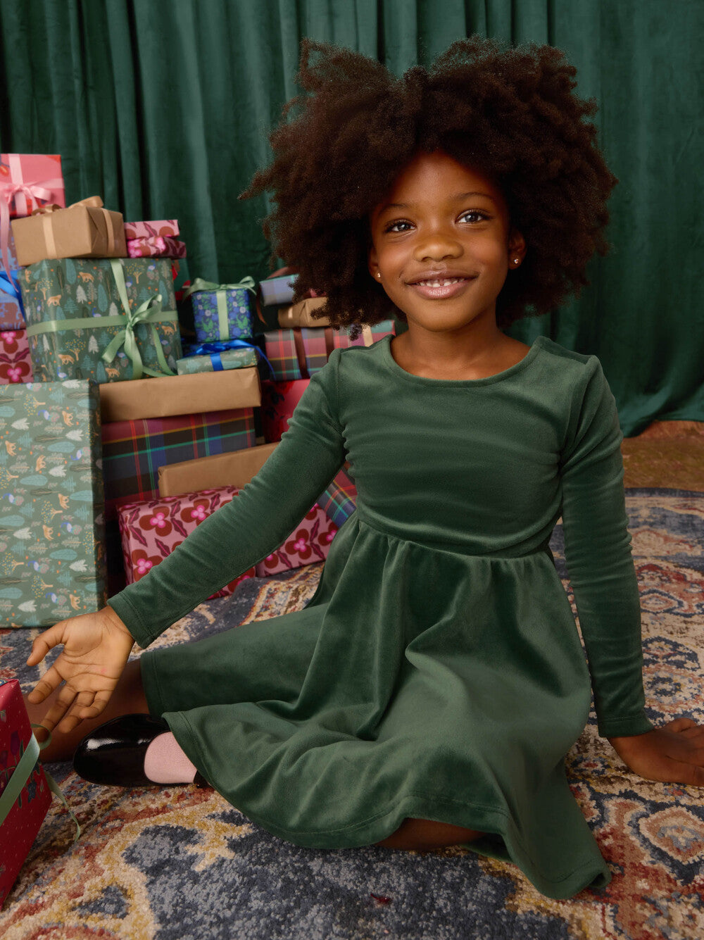 A true touch of luxe! Designed to dazzle, Tea Collection's heirloom-quality velour ballet dress promises warmth, elegance, and endless twirls. With a fitted bodice, classic boat neckline, and circle skirt, this piece will see them through the holidays and beyond. Below mid-thigh length. Crafted of stretchy polyester/spandex. Fitted bodice and circle skirt.