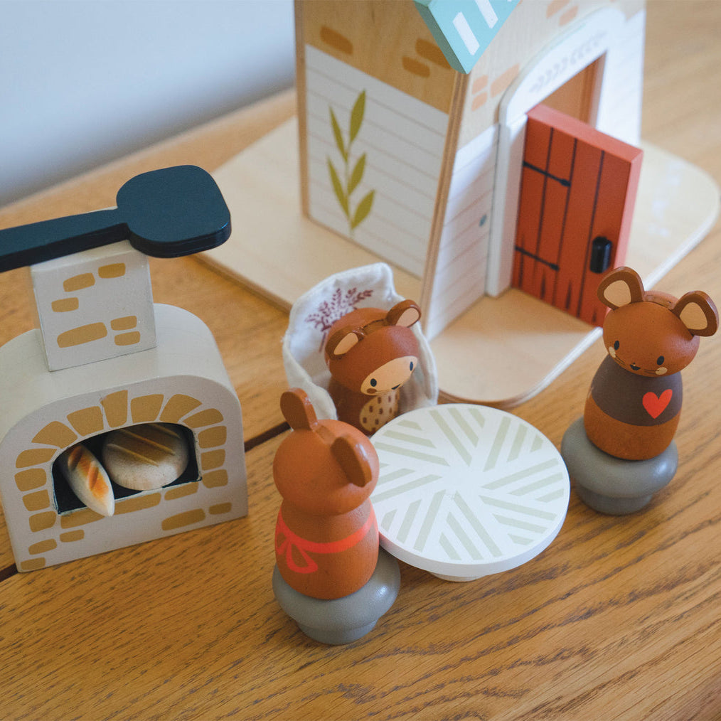 Accessories include: a bread oven, 2 loaves of bread, a bread shovel, table and 2 stools, a grain sack, a fabric armchair, a lamp, and a flour scoop that doubles up as a bed for the baby mouse. A wonderful toy for story telling and imaginative play with children.