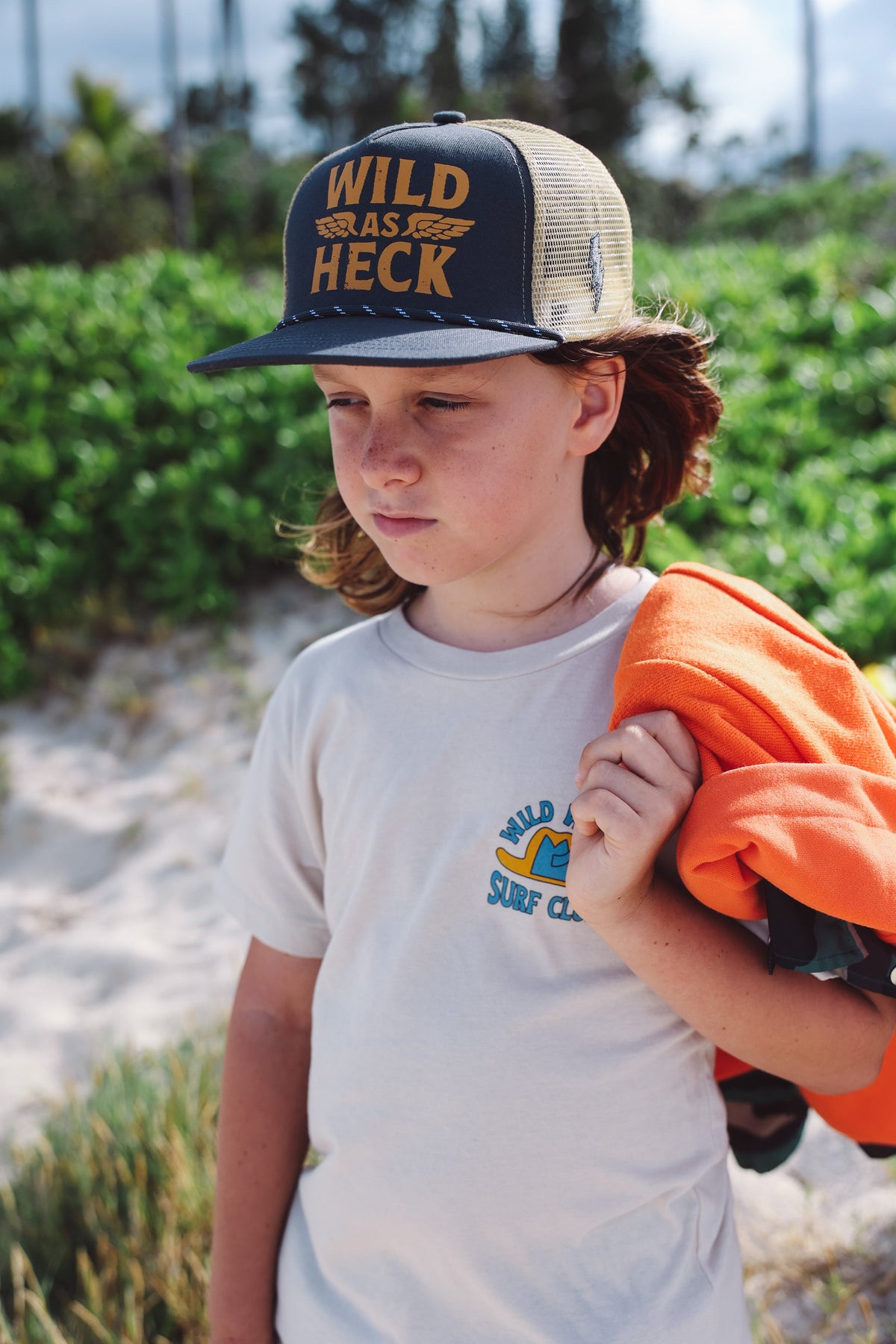 Tiny Whales is a bold and adventurous accessory designed for young explorers. Crafted with a 100% cotton front and a breathable 100% nylon mesh back, this hat ensures comfort during outdoor adventures. The adjustable snapback closure provides a customizable fit, Emblazoned with the "Wild As Heck" graphic, it adds a touch of personality to any outfit.