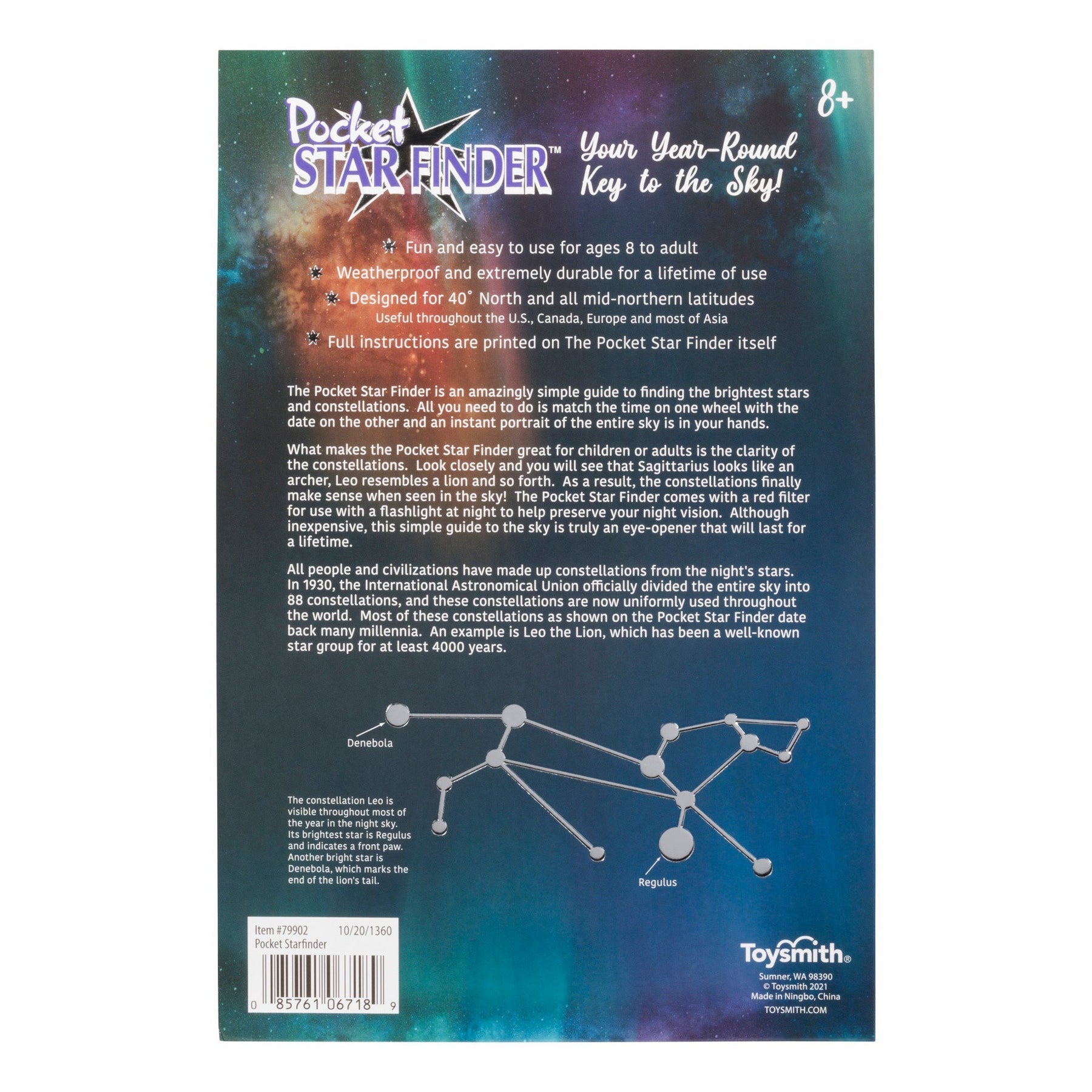 A mini-sized star-finding disc, the Toysmith Pocket Star Finder easily fits into pockets and includes simple use instructions. Discover major constellations in North America, Europe, and Asia. Made with high-quality, sturdy materials, this star finder is durable and weatherproof. Also includes a red night vision filter for use with flashlights. Take it anywhere for a fun nighttime STEM activity for kids and adults to do together.