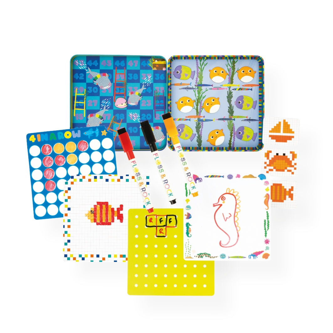 Floss & Rock's all new Magnetic Fun & Games Tin is packed with even more fun for on the go. Discover 6 activities and games - ‘Snakes & Ladders’, ‘Tic Tac Toe’, ‘Pixel Art’, ‘4 in a Row’, ‘Dots & Boxes’ and a doodle page! Each tin is reusable and comes with magnetic pop-out pieces, 3 colour dry wipe pens with erasers and a dice for game play! Ocean design is perfect for fish fanatics and shark lovers.