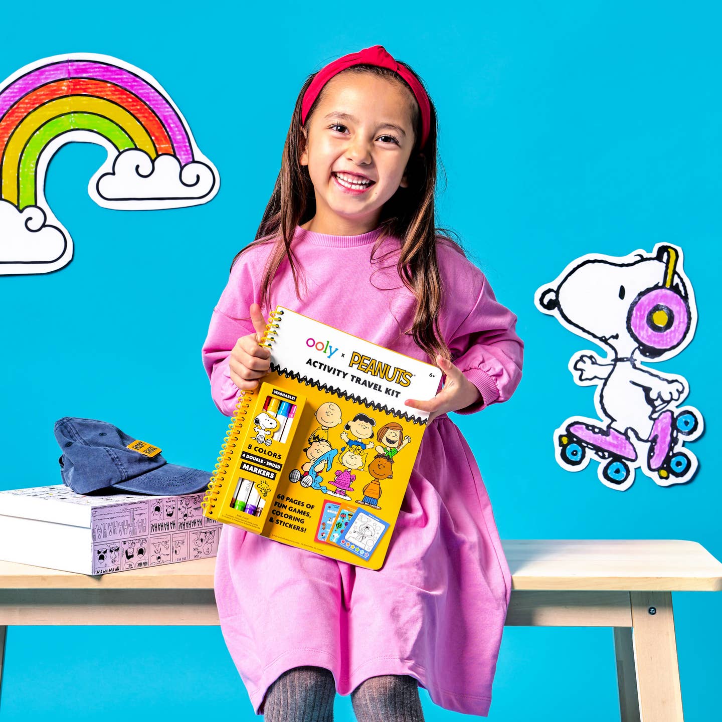 Join Snoopy, Charlie Brown, and the Peanuts gang for hours of fun with the OOLY x Peanuts Activity Travel Kit! Packed with 60 pages of puzzles, games, and coloring sheets, this travel-ready kit is perfect for kids who love Peanuts adventures. This activity set includes 4 double-ended markers with 8 colors and 2 sheets of Peanuts-themed stickers.