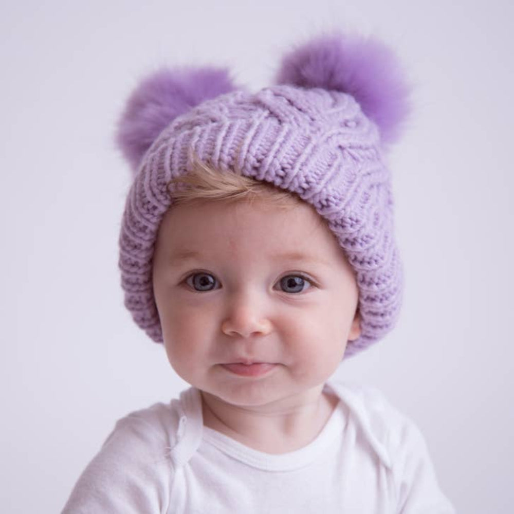 This sweet cable knit hat is topped with 2 dyed-to-match furry pom poms. It is just the cutest hat ever in a beautiful shade of lilac! What a perfect gift for showers, birthdays. It makes a great photo prop too. We offer this in other colors as well.