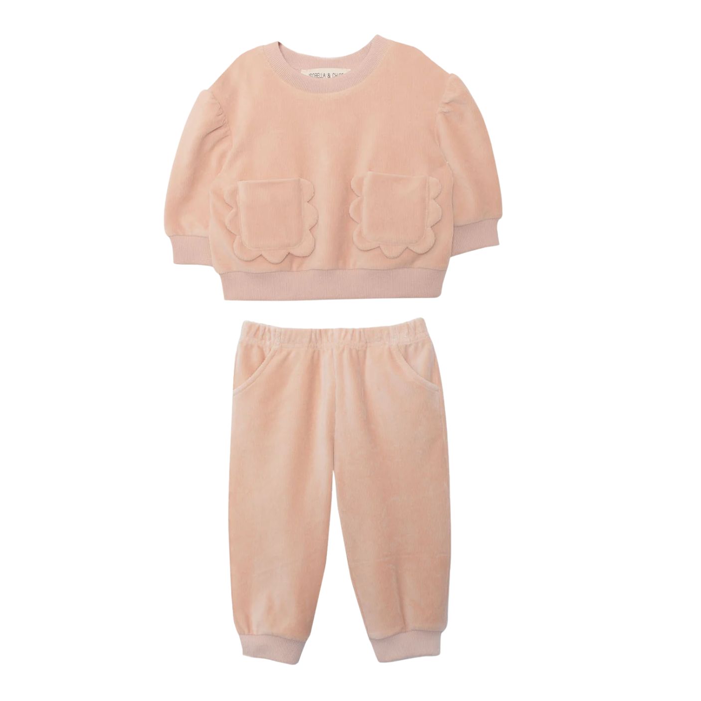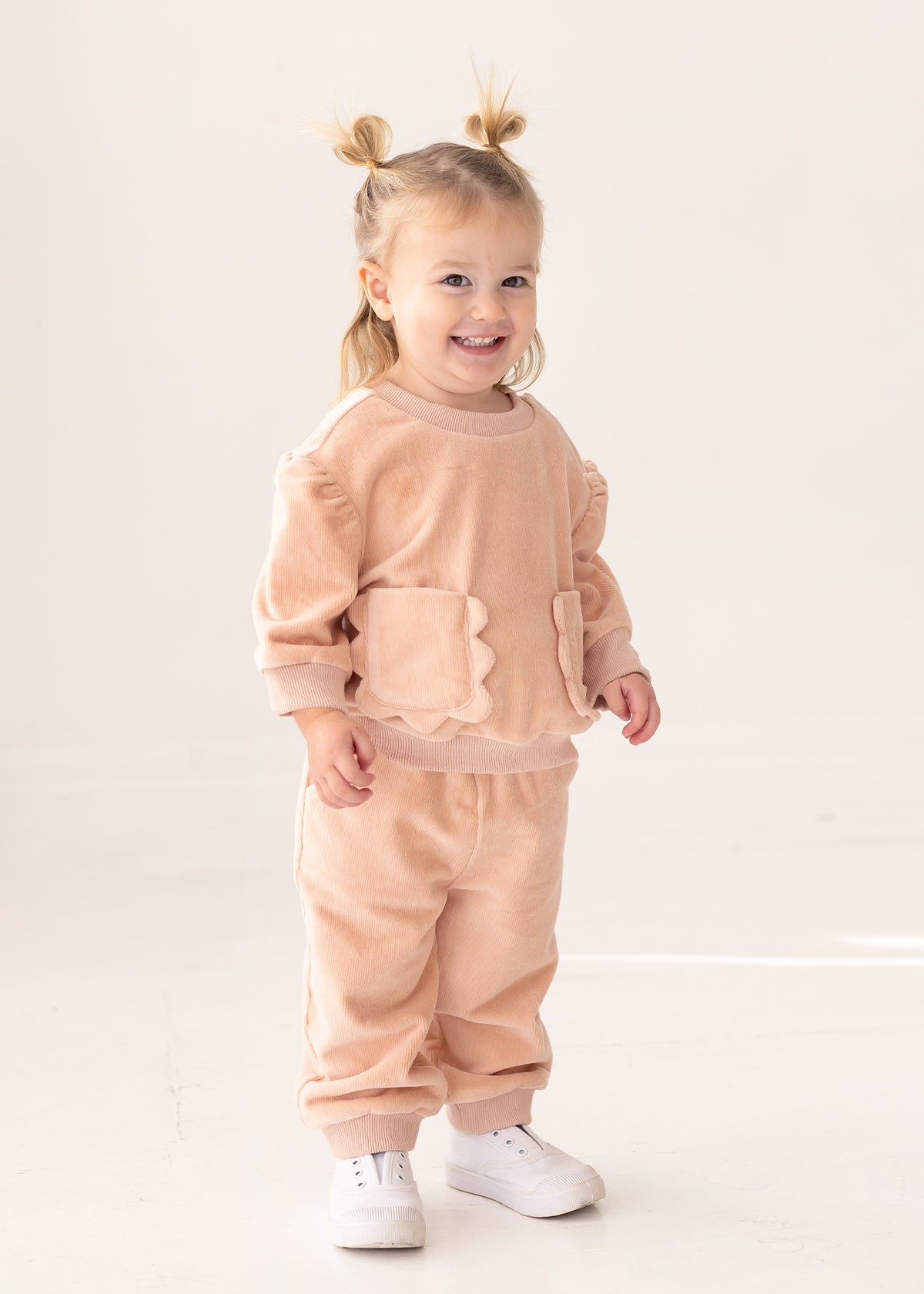 The Peach Keen two piece set in a soft peach tone combines sweet style and all-day comfort. The long-sleeve sweatshirt features adorable scalloped-edged square pockets, while the matching pants boast an elastic waistband and side pockets for easy wear. Perfect for playdates or cozy days at home, this set is equal parts playful and practical.