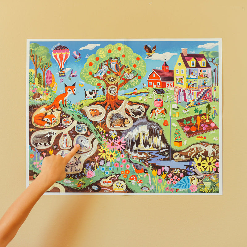 Overhead, trees blossom and birds fly, while underground, animals burrow: the subtleties of farming are revealed alongside inside views of a basement revealing pipes and boiler, even hidden fossils. Everything is carefully labeled on an amply sized poster included with the puzzle. The intelligent and fanciful artist Linda Bleck has created this enormous puzzle. Filled to capacity with detail and delightful moments of discovery, it covers new ground in the floor puzzle category, making this format both a fully educational activity and a rich individual play experience.