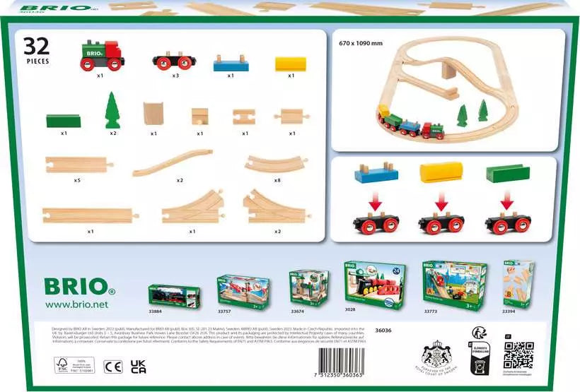 Celebrate classic railway play with the 36036 65th Anniversary Train Set. This all wooden train set takes inspiration from our iconic BRIO railway products first launched in 1958. The 32 piece set is made from FSC (FSC-C111262) certified European beech wood and includes a classic BRIO train with 3 wooden wagons in bright colours, bridge, switching tracks and wooden trees for scenic decoration.