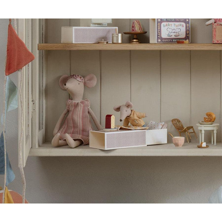 This mouse is ready for hours of play and sleeps tight in a little matchbox. The clothes and bedlinen are made of soft fabrics with unique prints and beautiful colors.