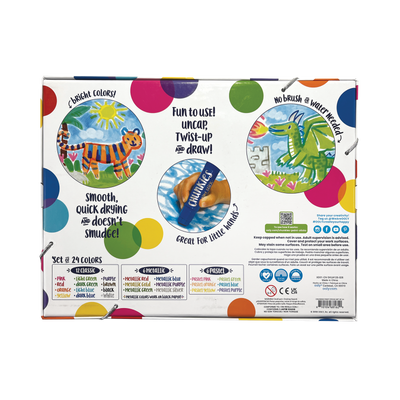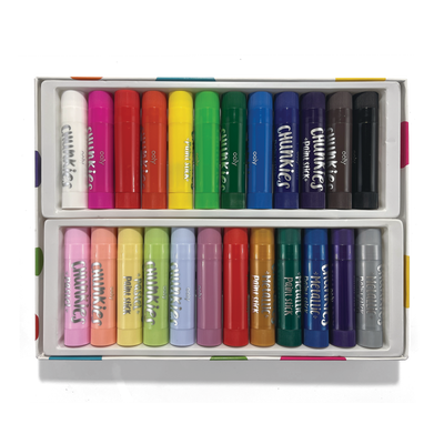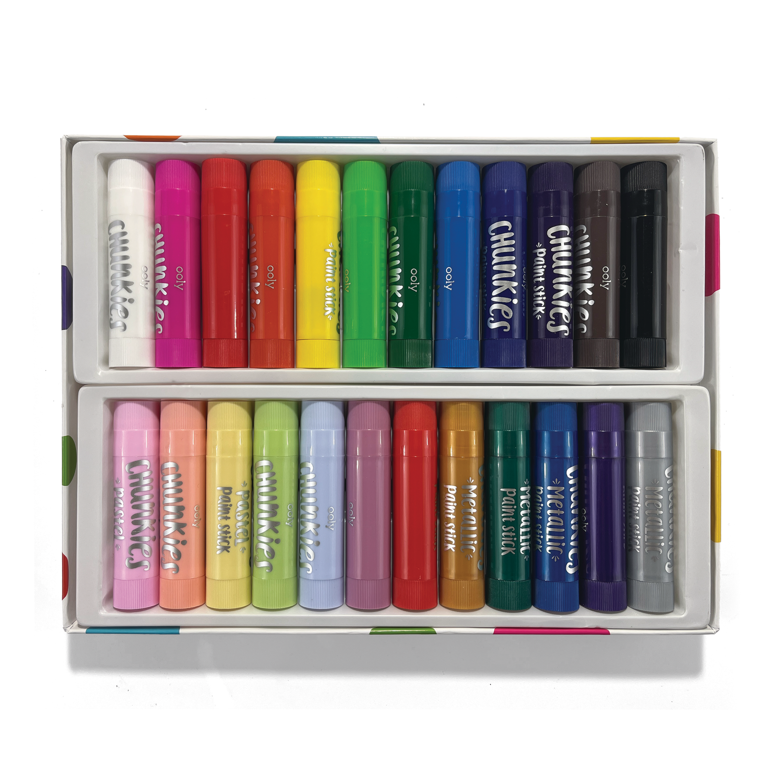 Little artists love painting, but while parents love the pictures, they don’t always love the mess. With easy to grip Chunkies Paint Sticks, kids have more control of keeping the paint on the paper and off the walls. The quick drying colors mean no more unintentional smudges, plus pictures are ready to hang almost instantly. The Chunkies Paint Sticks Variety Pack has 24 colored paints - 12 classic, 6 shiny metallics, and 6 pretty pastels. Care and use recommendations: Keep capped when not in use, to help prevent drying. Cover and protect your workspace. This product may stain some surfaces.