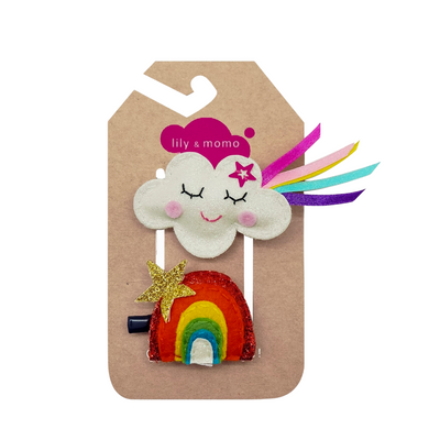 Handmade rainbow and cloud hair clips with ribbon detailing.