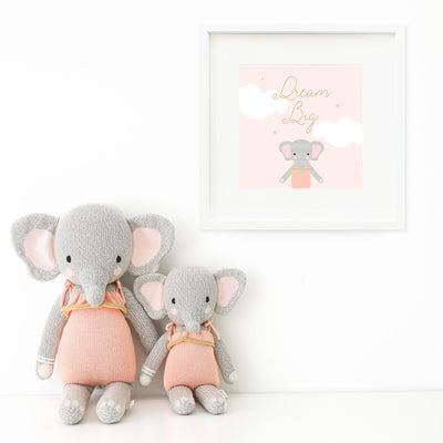 An enchanting handcrafted doll designed to inspire love and kindness in children. Made with high-quality, soft materials, it's perfect for snuggles, playtime, or as a decorative piece in your child's room. Each purchase helps provide meals to children in need, making this adorable elephant is not just a toy, but a way to make a positive impact. With her charming design and heartwarming story, Eloise the Elephant is sure to become a beloved companion for your little one.