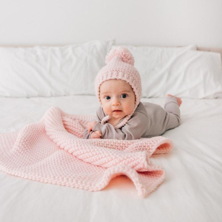 This cozy soft blanket knit in Natural or Blush hued yarn is the perfect size for Moses baskets, strollers and car seats. What a great baby shower gift!