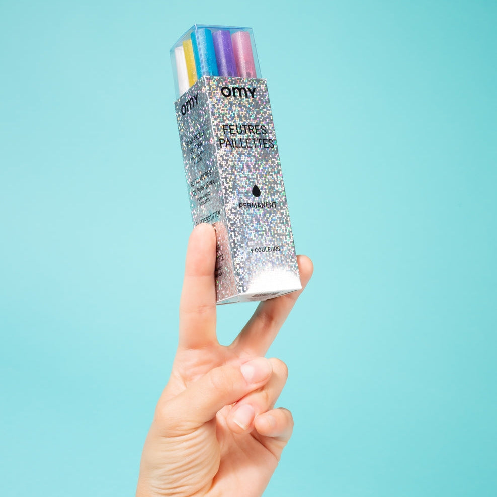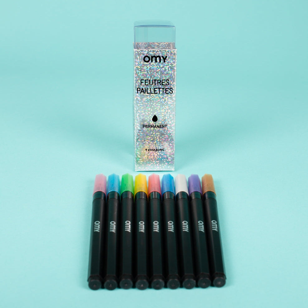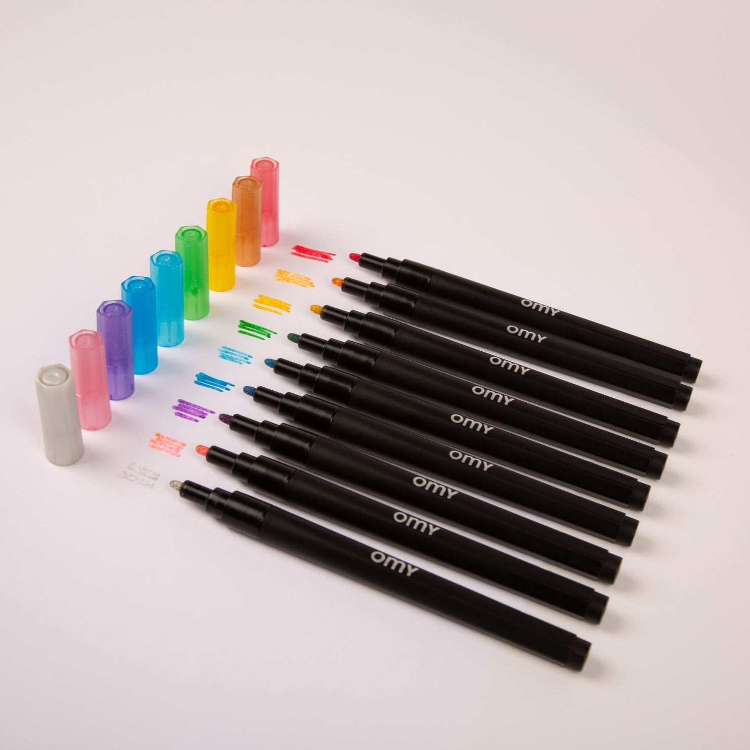 Bring sparkles to your colorings with the OMY Glitter Markers! The shimmery colors bring depth and sparkles to your drawings. Press markers down to bring glitters out. Use on any color paper and surfaces. Assortment of 9 waterproof and sunroof glitter colors: blue, violet, yellow, silver, green, pink...