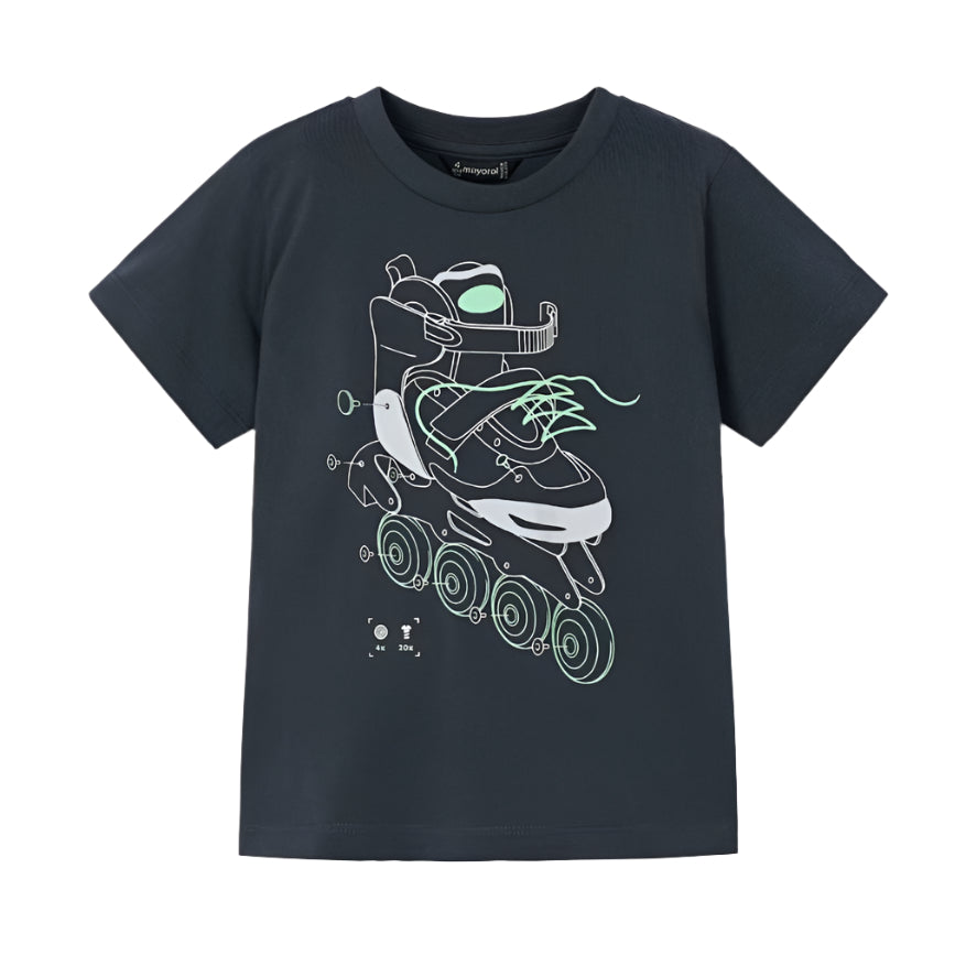 The Glow In The Dark Rollerblade Tee in Asphalt by Mayoral is a stylish and fun addition to any young skater's wardrobe. This t-shirt features a unique glow-in-the-dark rollerblade graphic on an asphalt-colored background, making it both eye-catching and playful.